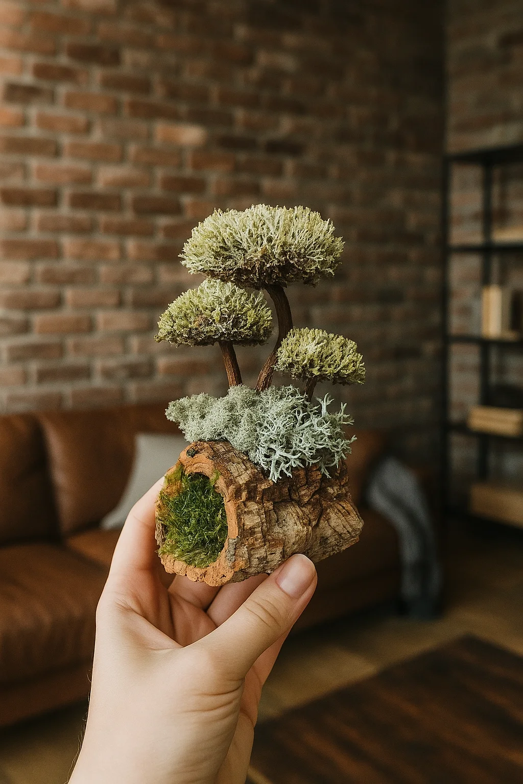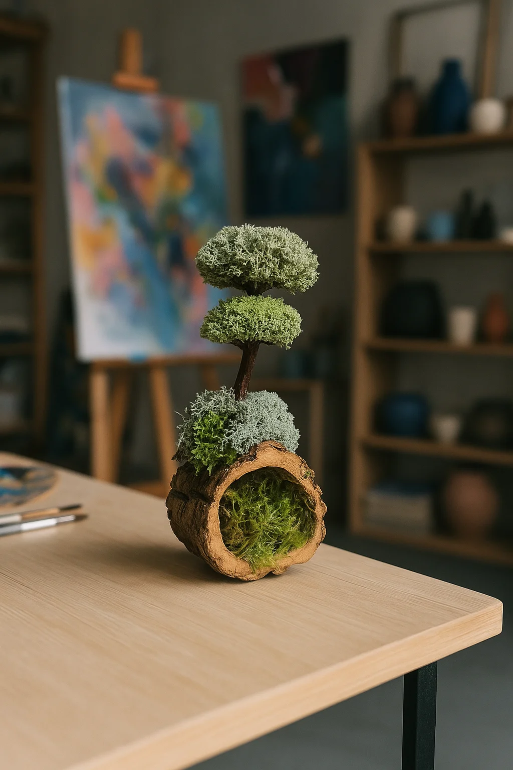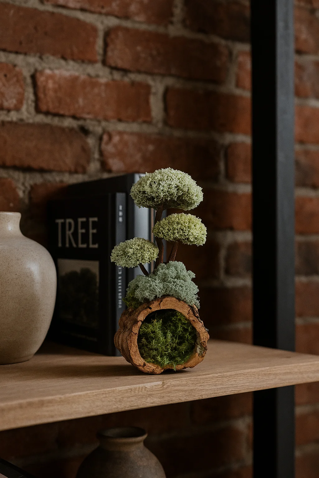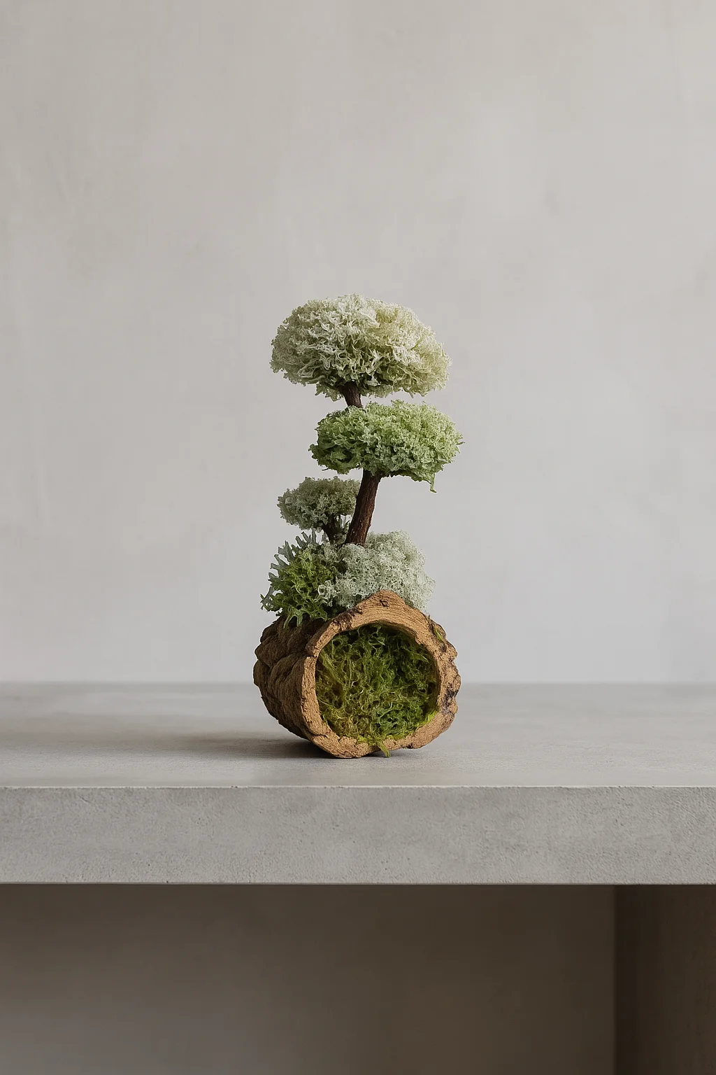 Три яруса кроны, будто сошедшие с японской гравюры. Фактурный фрагмент коры, внутри которого прячется зелёная тень — как вход в сказочный лес. Это дерево из исландского мха создано для тех, кто умеет ценить детали и находит красоту в тишине.