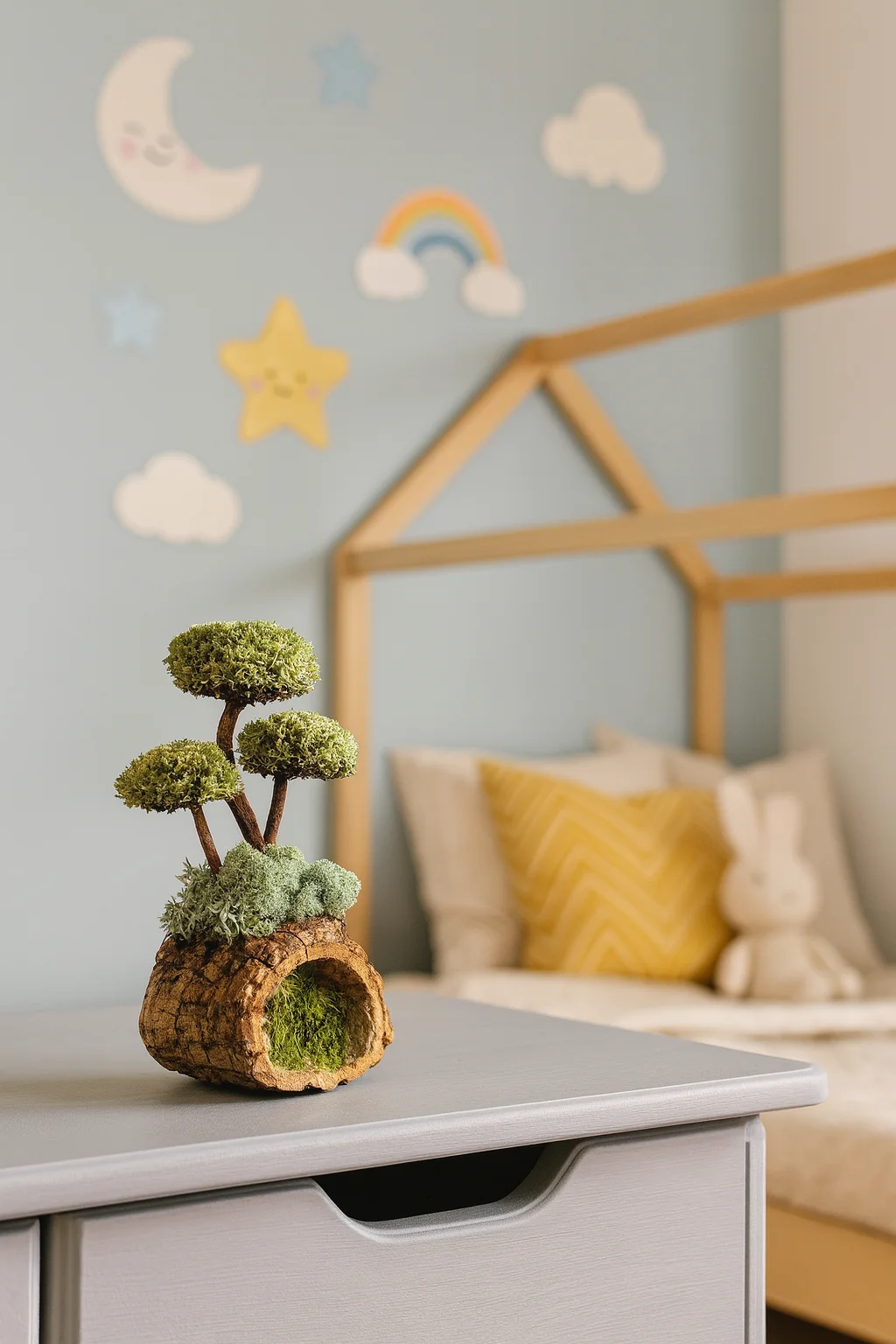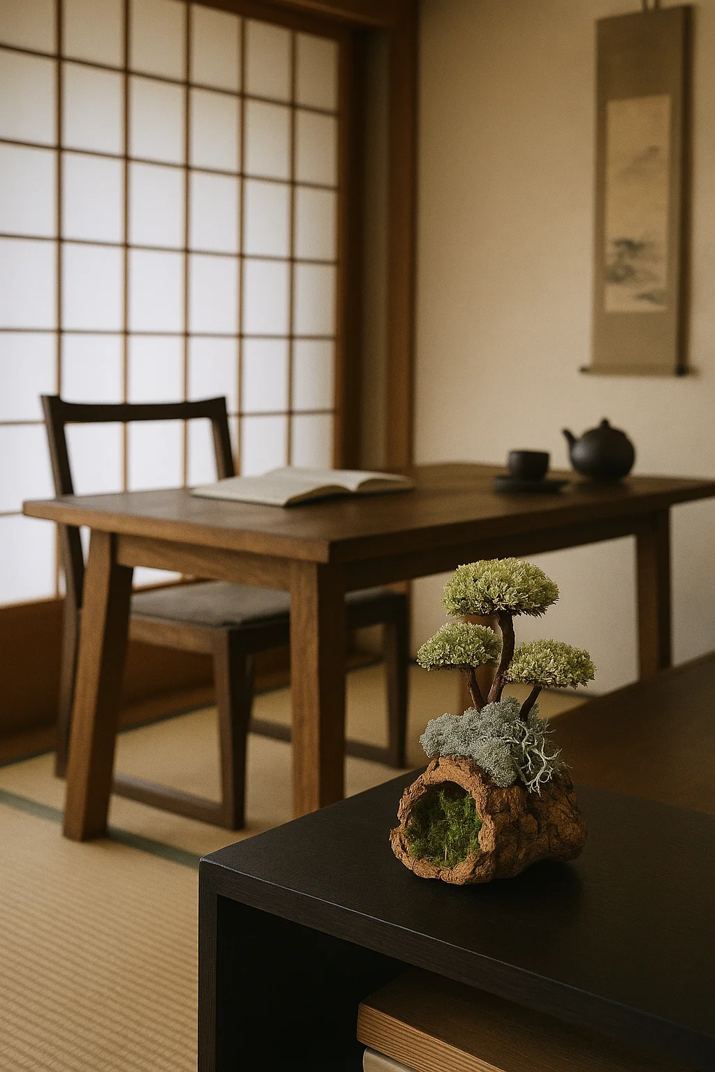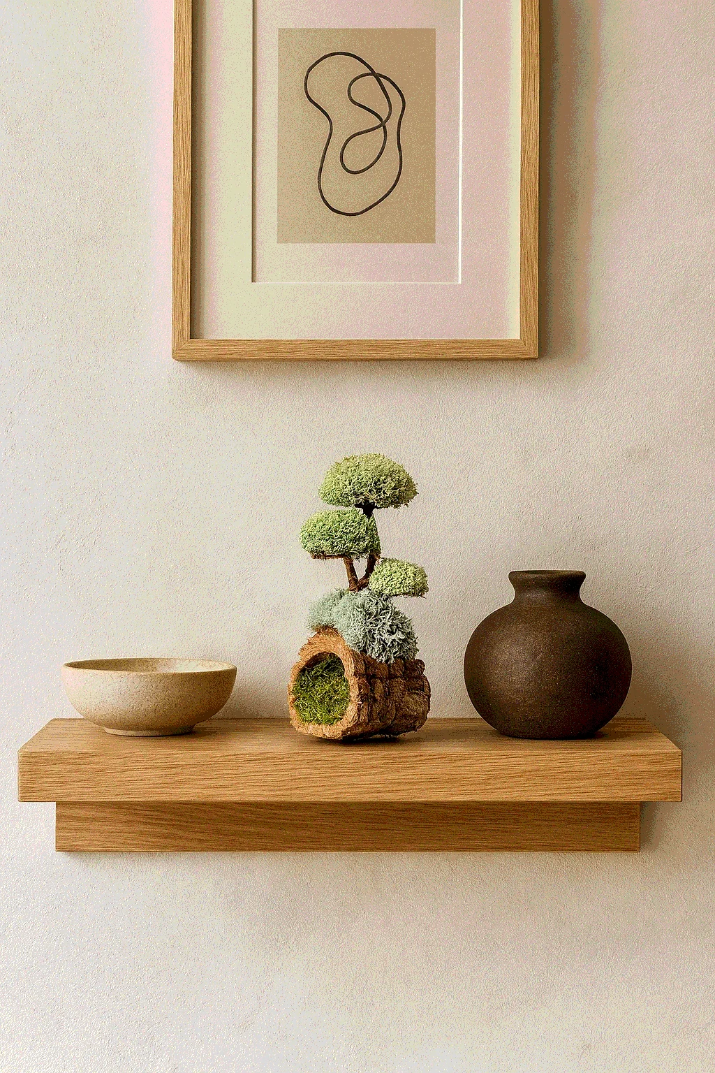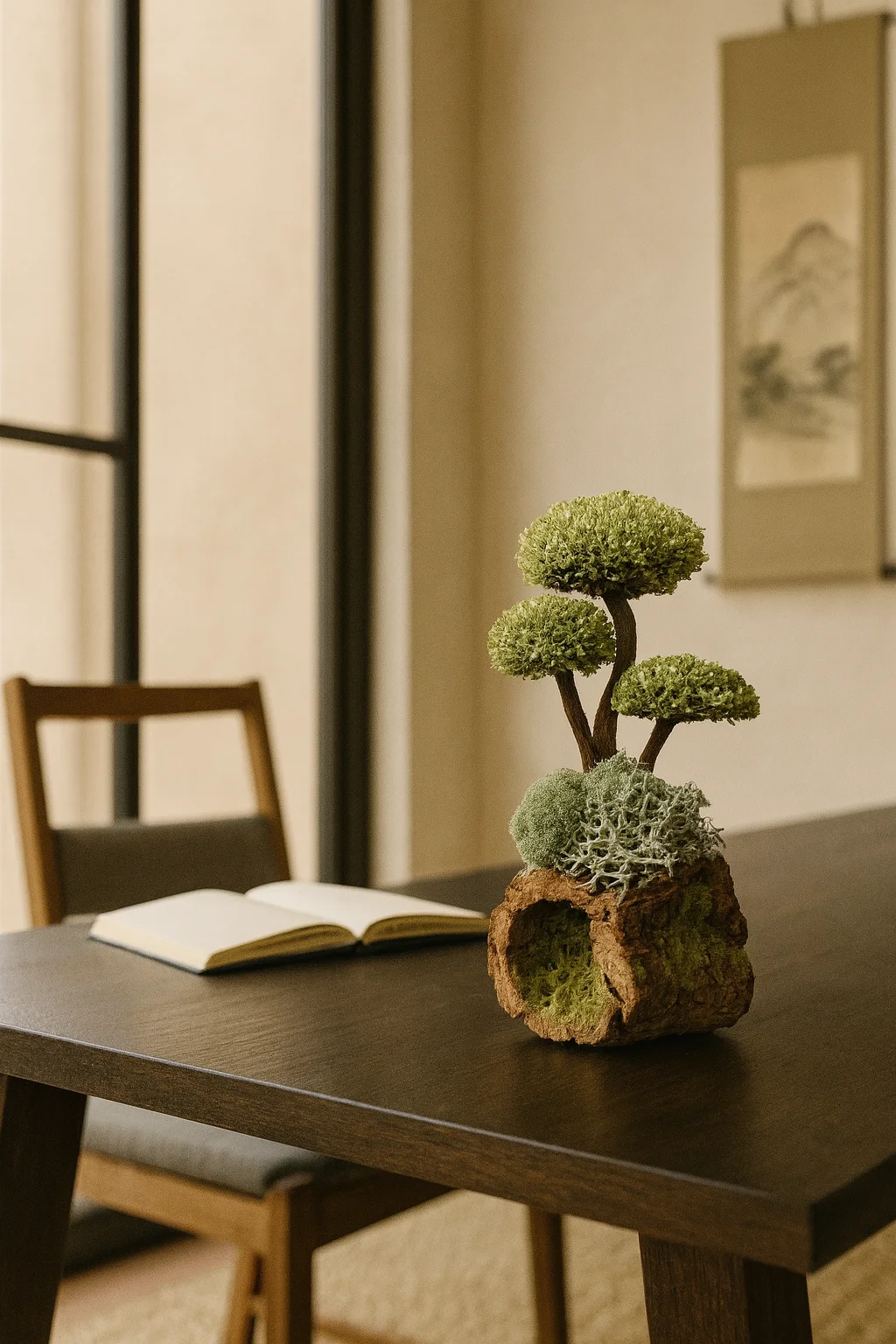 Три яруса кроны, будто сошедшие с японской гравюры. Фактурный фрагмент коры, внутри которого прячется зелёная тень — как вход в сказочный лес. Это дерево из исландского мха создано для тех, кто умеет ценить детали и находит красоту в тишине.