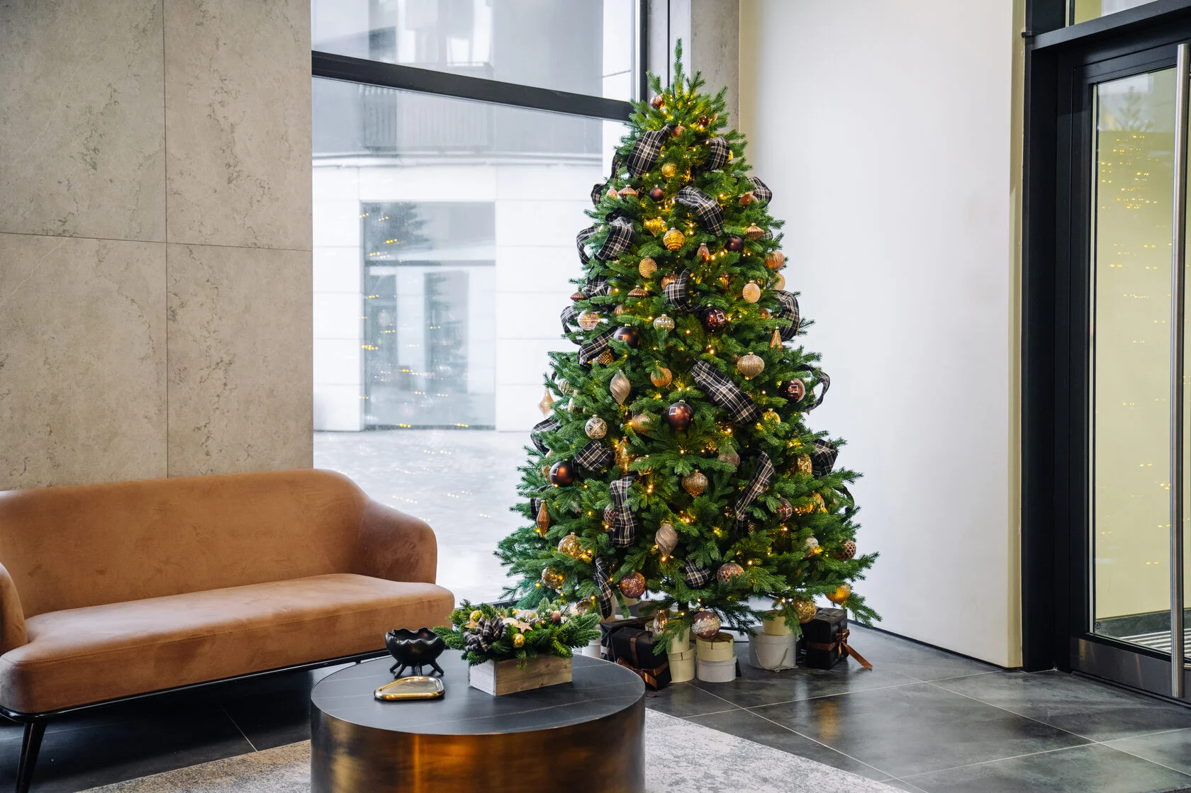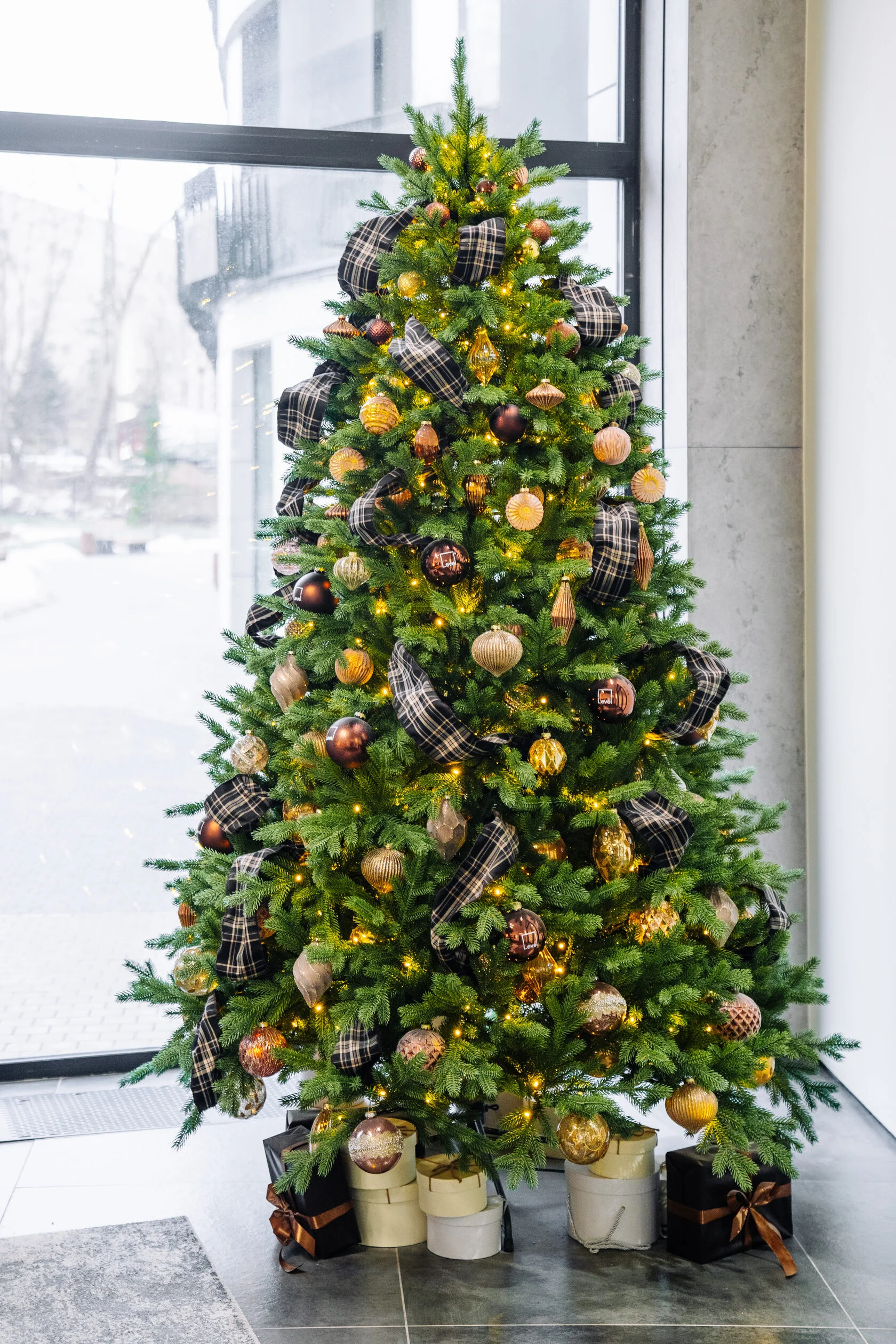 Эта ель окутана теплом и уютом, как осенняя сказка, переходящая в зимнее великолепие. Её густая тёмно-зелёная хвоя оживает под мягким светом встроенной гирлянды, а глубокие шоколадные шары напоминают спелые каштаны, готовые к сбору. Золотые шишки, банты и бусины придают композиции изысканный блеск, создавая атмосферу гармонии и богатства.