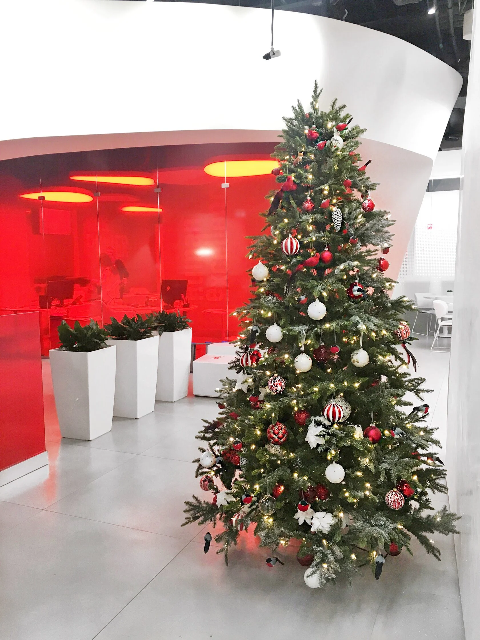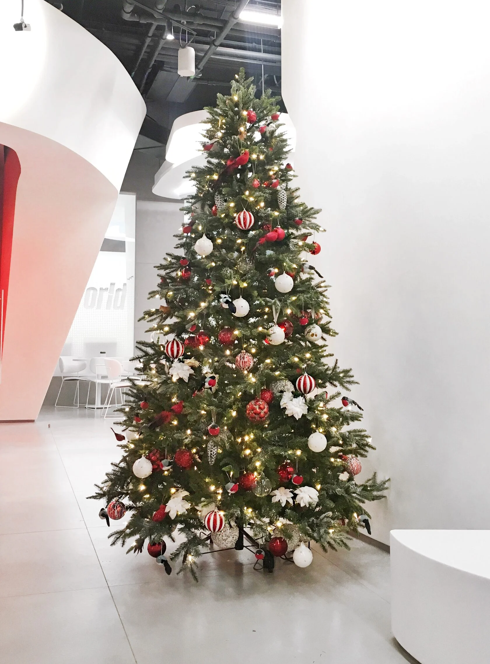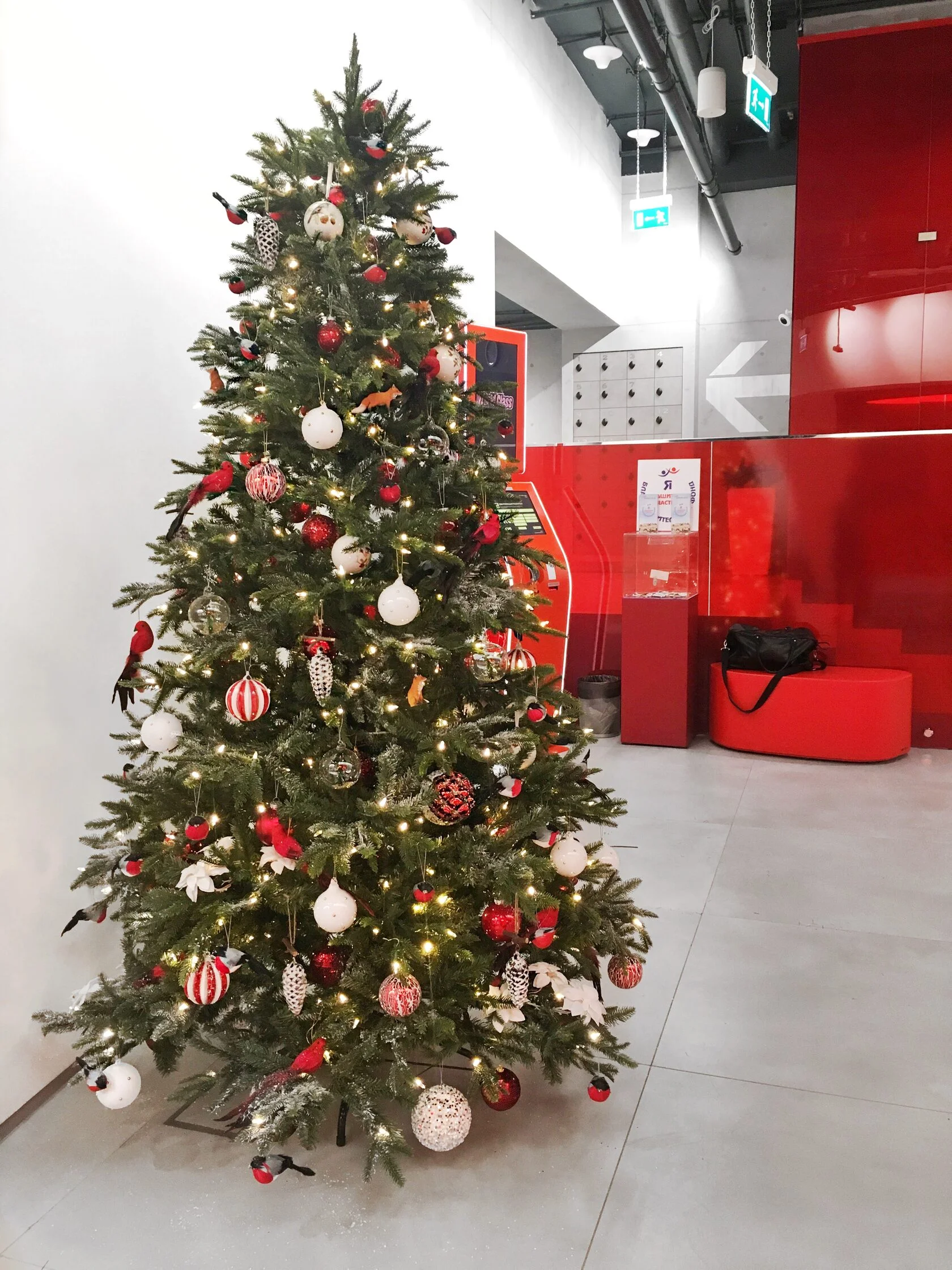 Эта ель воплощает в себе магию и изысканность. Её густая зелёная крона, выполненная из литого материала, оживает под мягким светом встроенной гирлянды, а декоративные элементы в белых и насыщенных красных тонах наполняют пространство теплом, уютом и атмосферой праздника. Под елью уютно расположились праздничные подарки, завершая композицию и превращая её в главный символ торжества.