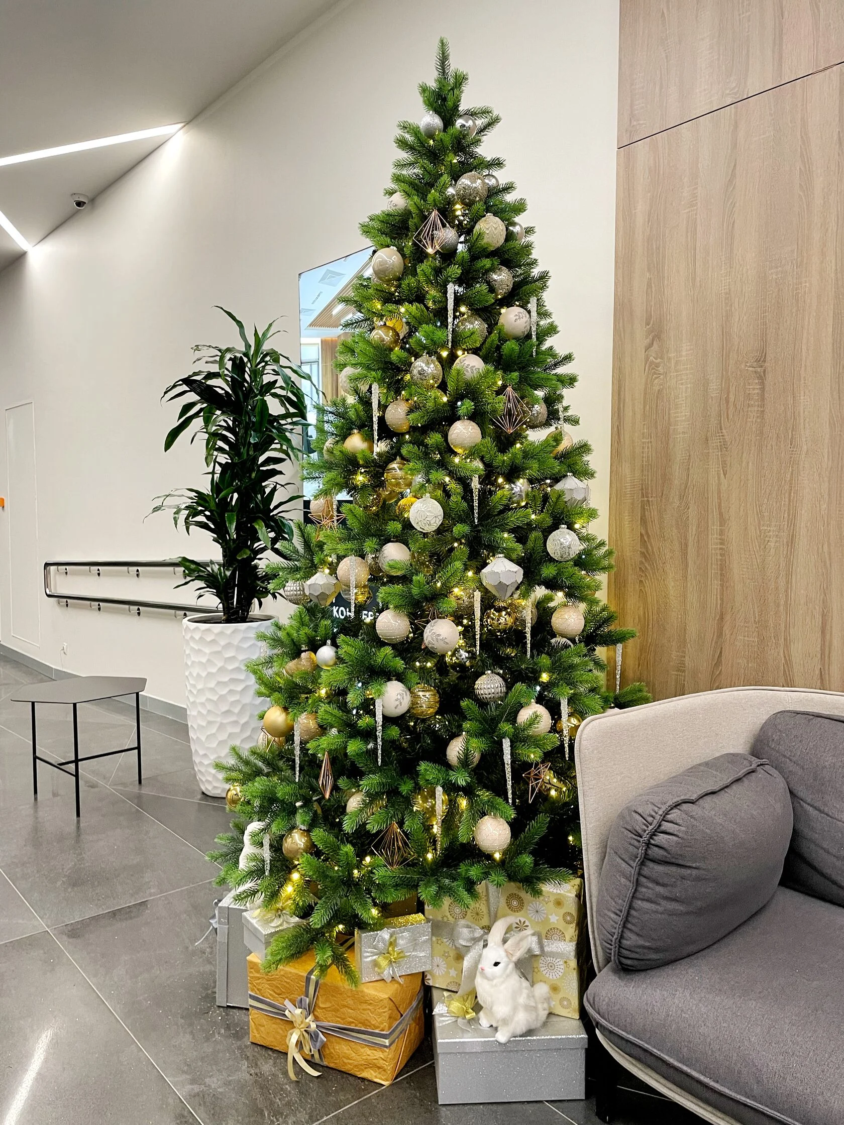 Эта ель — не просто украшение для новогодних праздников, а настоящее произведение искусства. Её густая, искусственная хвоя, украшенная встроенной гирляндой, наполняет дом мягким сиянием и уютом. Игрушки с разнообразными формами и текстурами создают гармоничную композицию, а подарки, собранные у основания, завершают образ, превращая пространство интерьера в место, где чудеса становятся реальностью.