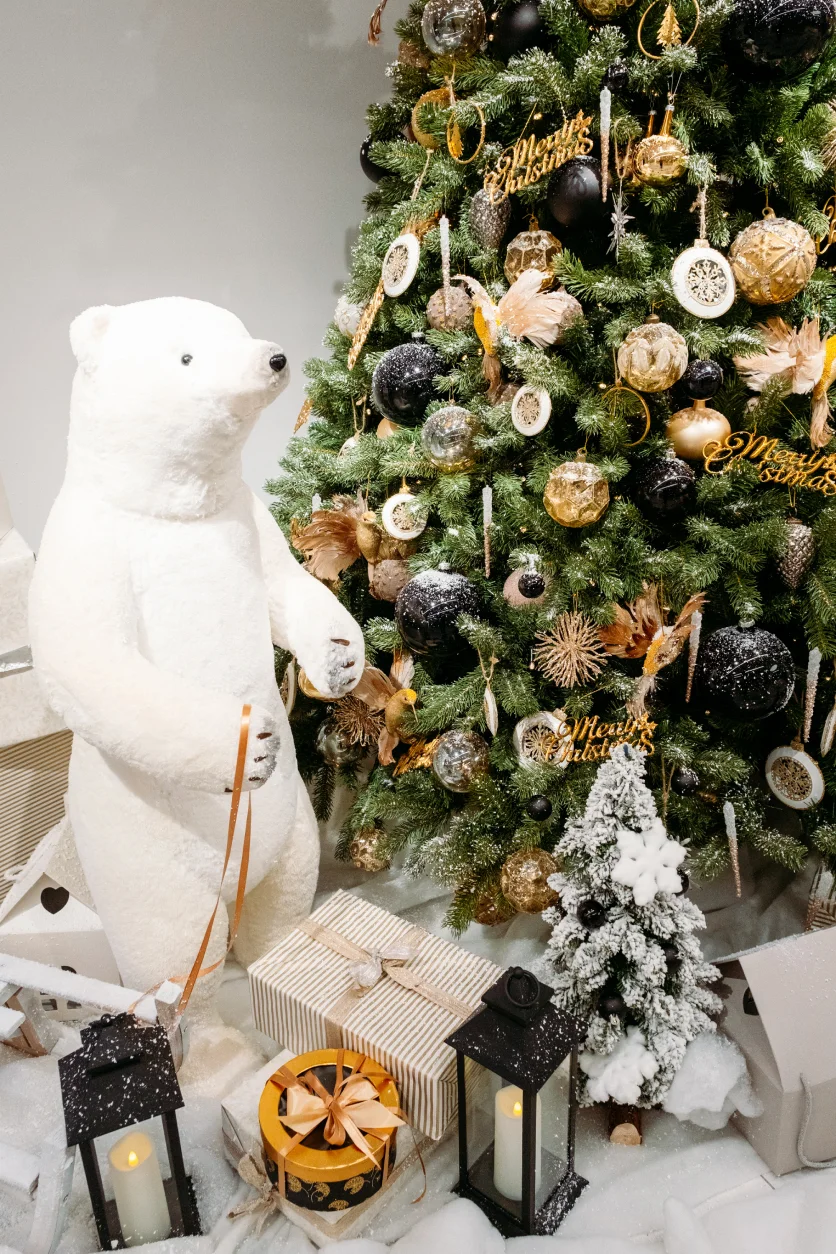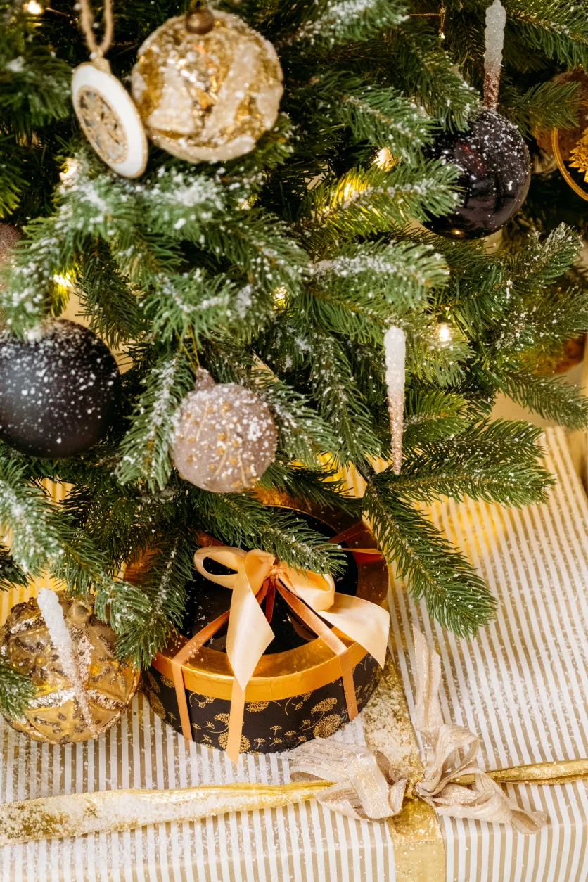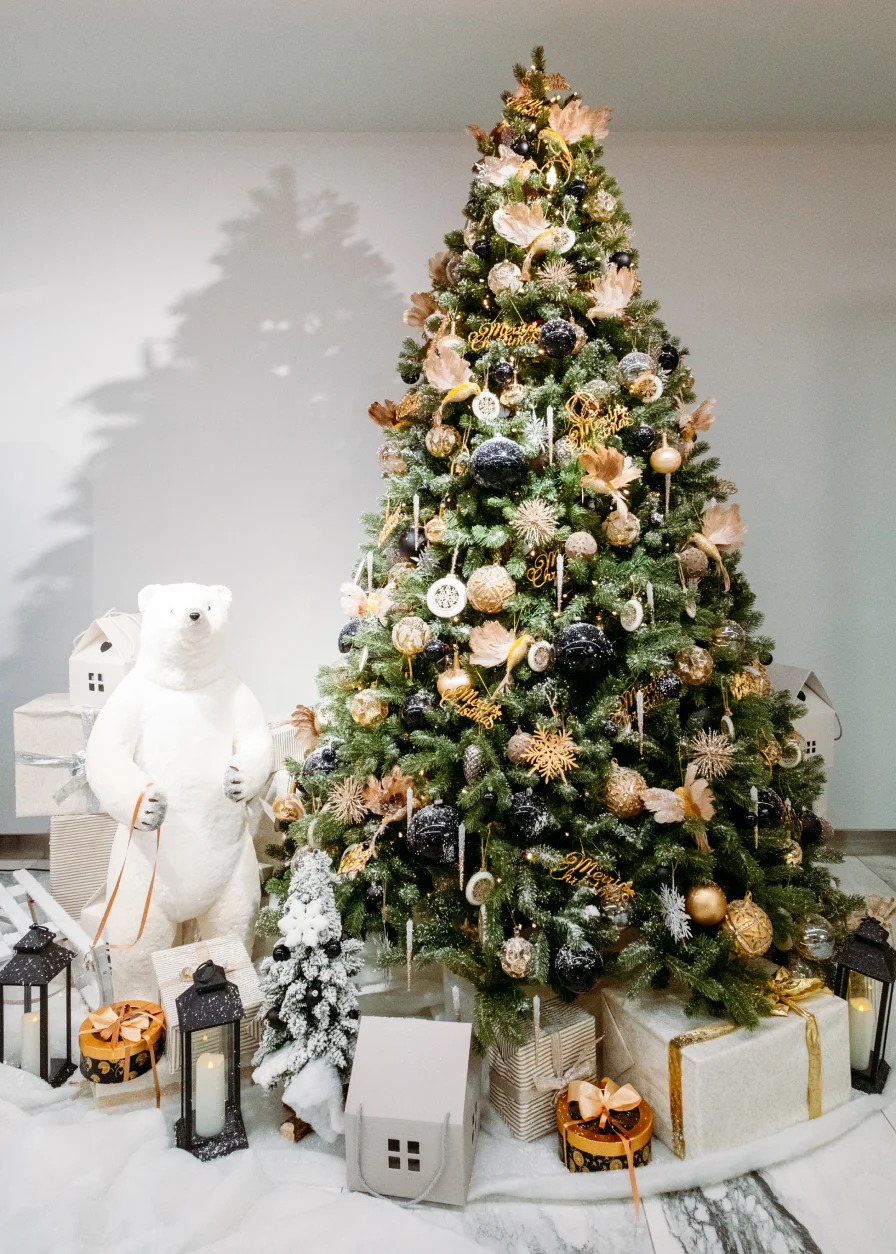 Эта ель — воплощение зимней таинственности и величия. На её густых ветвях мерцают загадочные чёрные шары, глубокие и тёмные, как космос. Рядом с ними золотым светом сияют украшения, словно далёкие звёзды. В мягком свете гирлянды ель становится символом гармонии природы и новогоднего чуда.