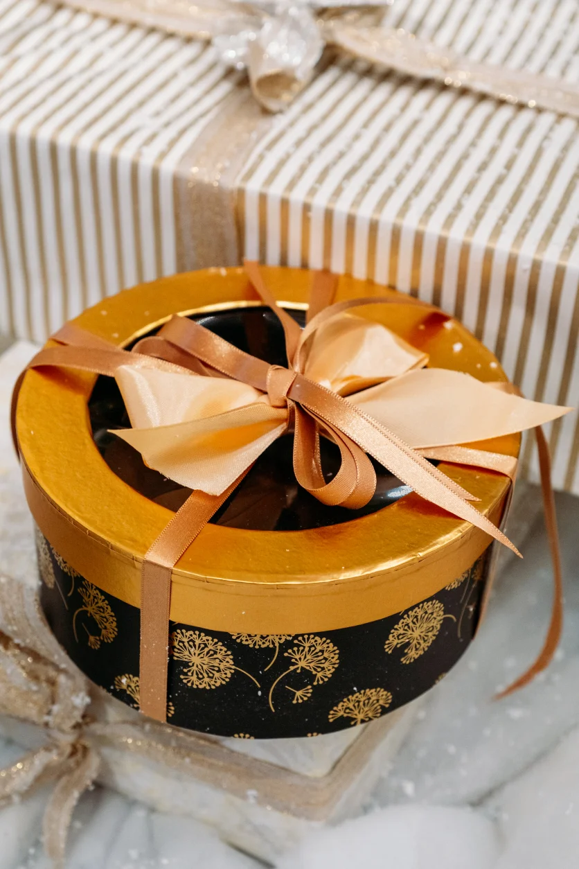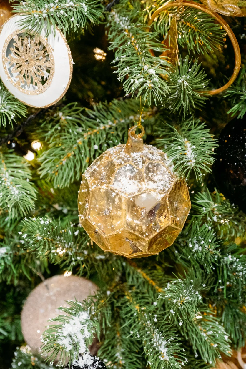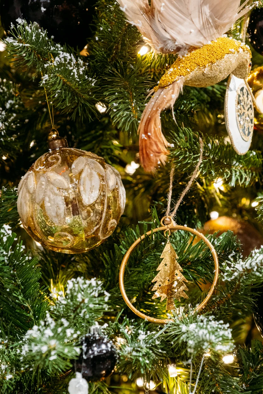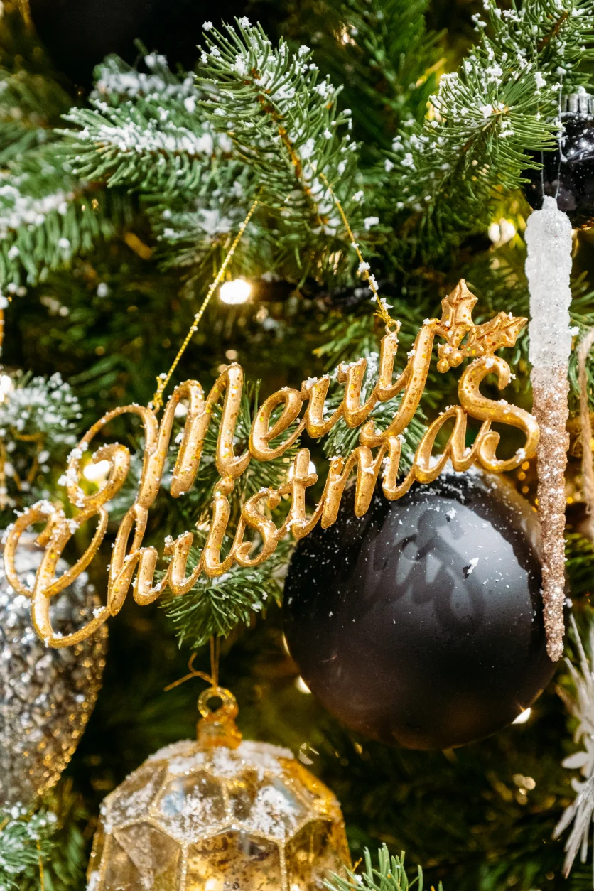 Эта ель — воплощение зимней таинственности и величия. На её густых ветвях мерцают загадочные чёрные шары, глубокие и тёмные, как космос. Рядом с ними золотым светом сияют украшения, словно далёкие звёзды. В мягком свете гирлянды ель становится символом гармонии природы и новогоднего чуда.