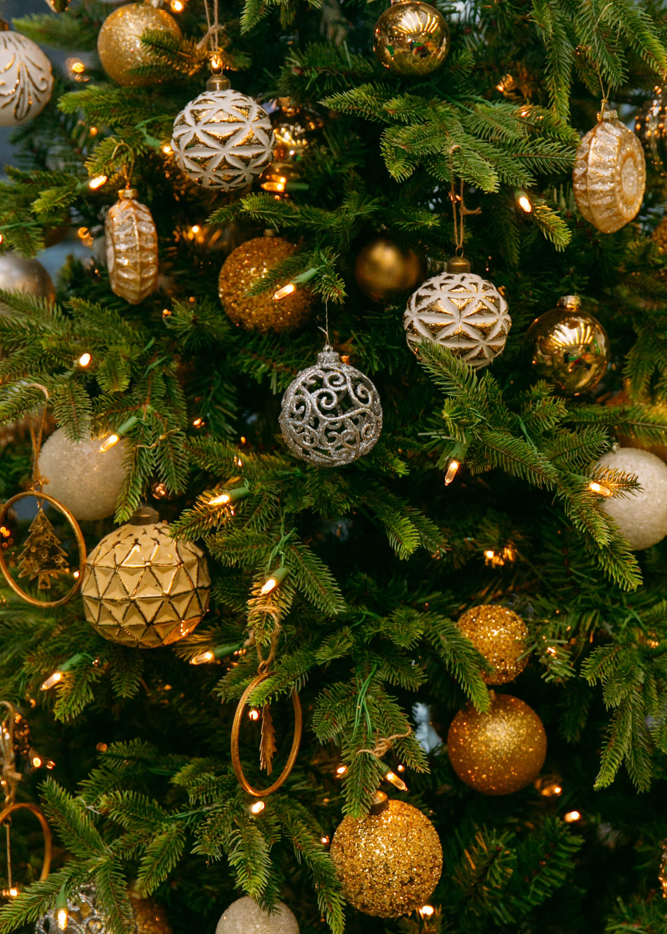✔ Комплект игрушек разных диаметров: 50% пластик, 25% стекло, 25% дизайнерские украшения и фигурки