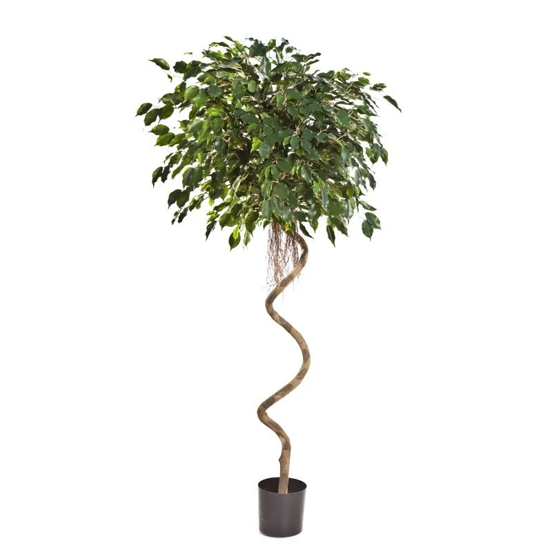 Фикус Бенджамина Спираль выделяется среди других фикусов своим тонким, забавно изогнутым стволом и зонтичной кроной.