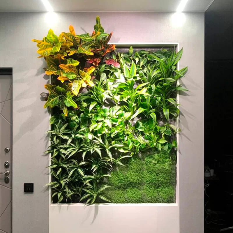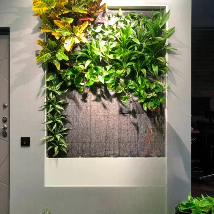 Фитостена вр входной зоне стал эффектным элементом дизайна, украшая пространство, создавая благоприятную атмосферу для посетителей. Живая зелень поможет смягчить впечатление от городского шума, улучшить качество воздуха и создать уютную атмосферу с первых шагов в помещение.
