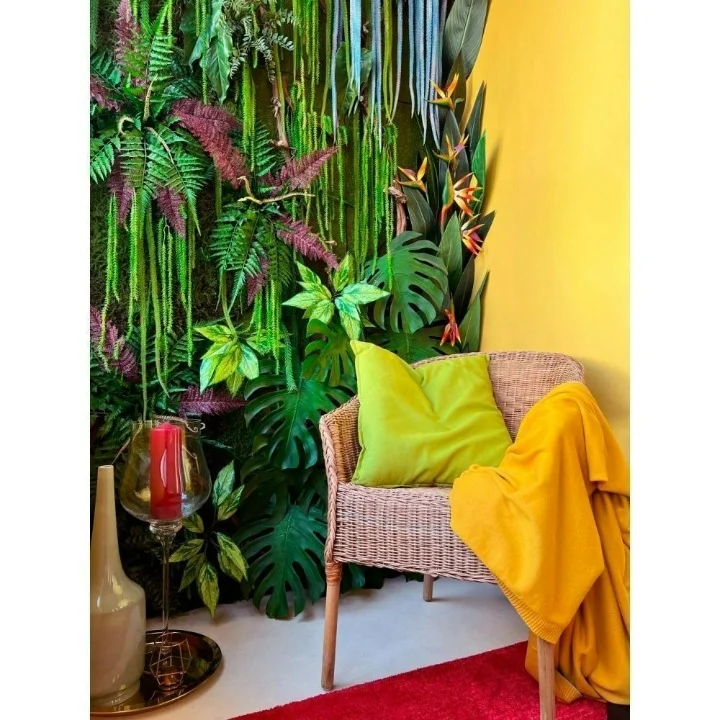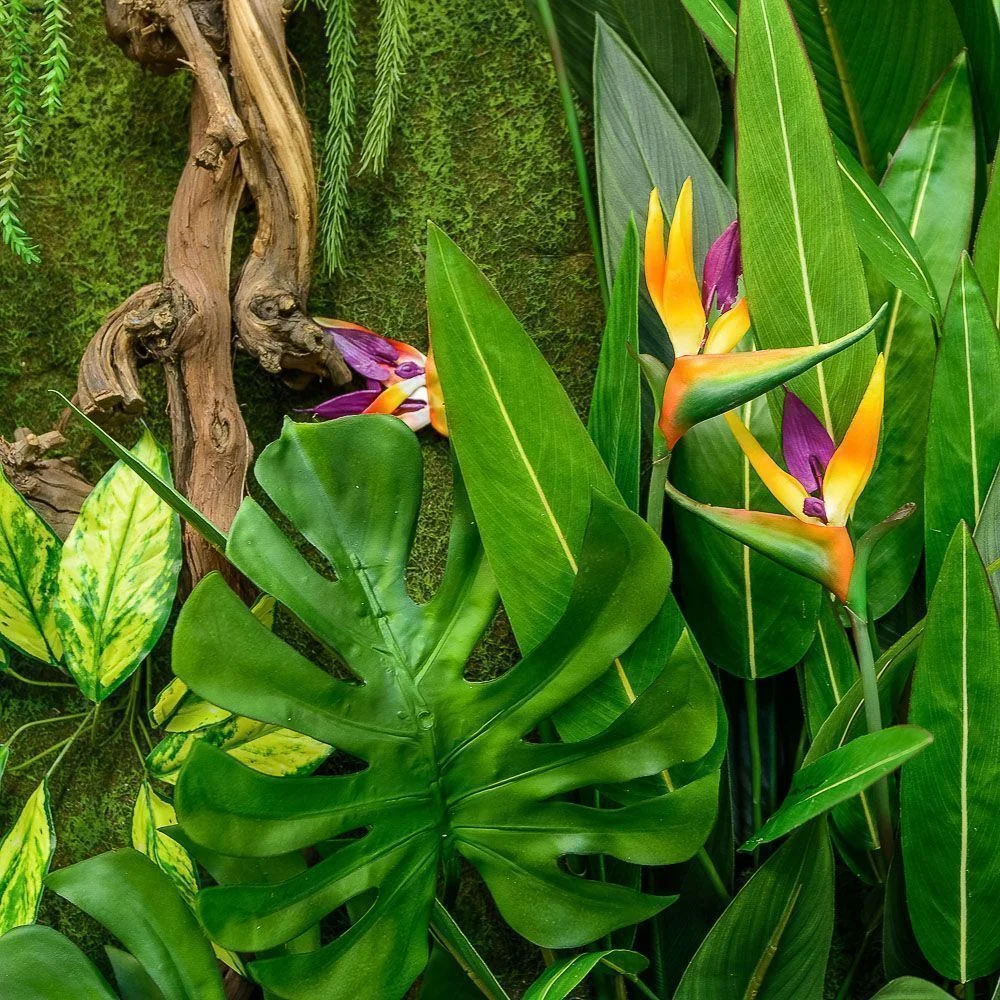 Фитостена, созданная из стабилизированного мха, амаранта, королевской стрелиции, монстеры премиального качества, образует гармоничную композицию, которая станет ярким акцентом в любом интерьере, будь то жилое или коммерческое помещение.
