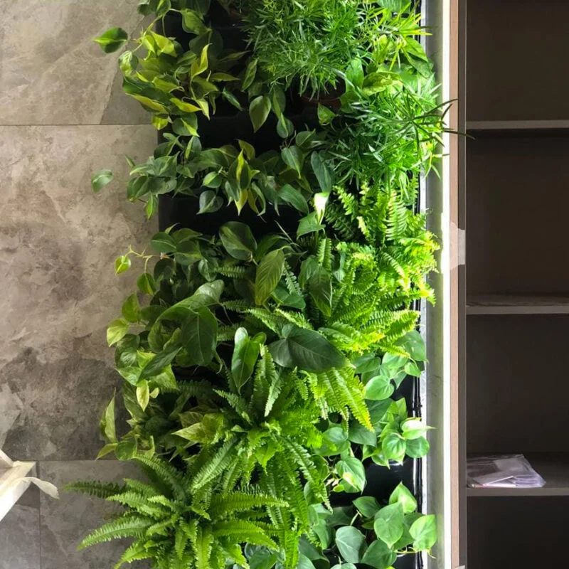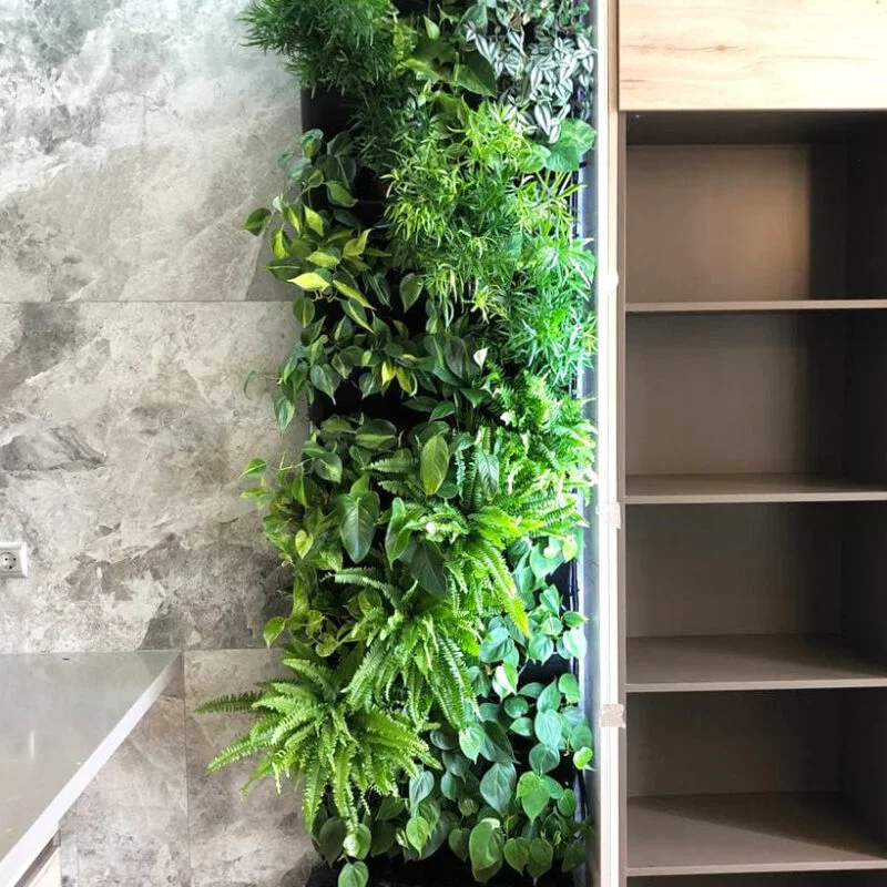 Фитостена в столовой создает особую атмосферу для трапезы, улучшая микроклимат и становясь стильным акцентом интерьера. Узкая конструкция с живыми растениями быстро монтируется и не требует сложного ухода.