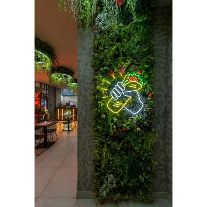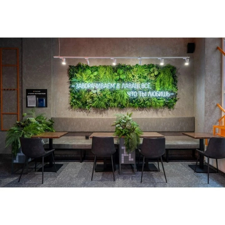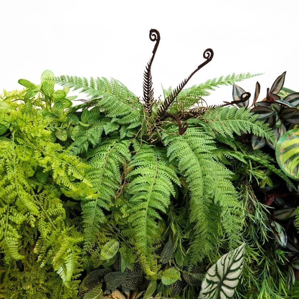 Фитостена, созданная из различных растений и папоротника премиального качества, образует гармоничную композицию, которая станет ярким акцентом в любом интерьере, будь то жилое или коммерческое помещение.