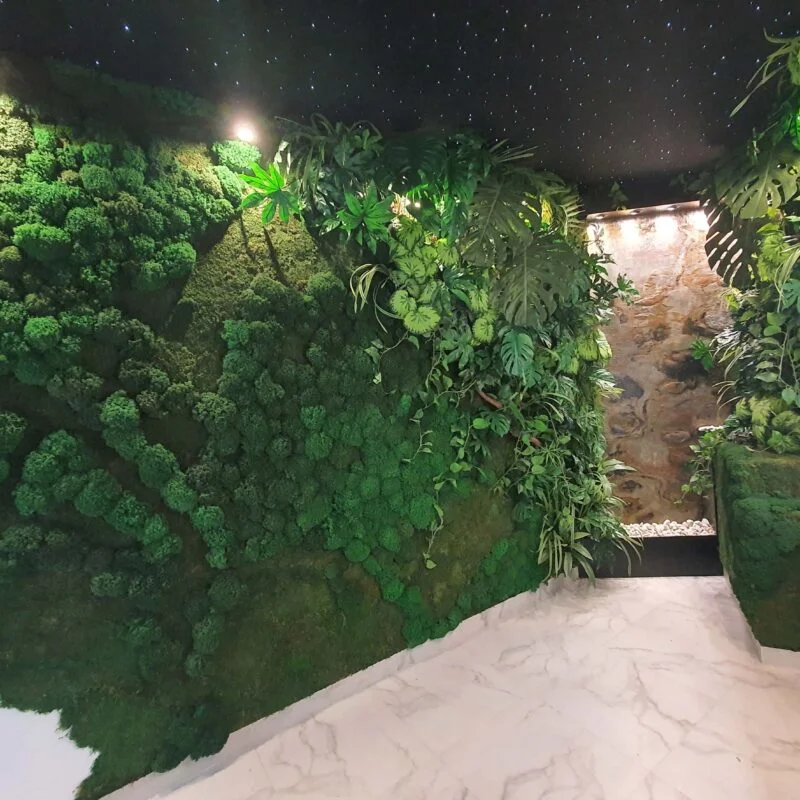 Создание премиальной атмосферы с природными элементами, гармонично сочетающими комфорт и современность. Основной декор — панно из стабилизированного мха и искусственных растений, украшающие стены.