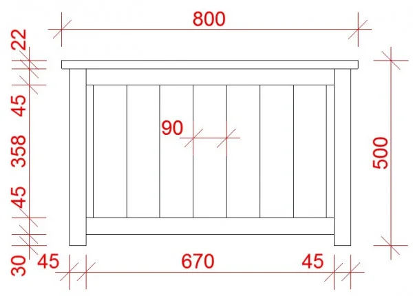 - КАРКАС: Вертикальная обшивка, имитация бруса, углы брус 45*45 мм с ножками, верхний ободок-юбка 100 мм, декоративные наконечники