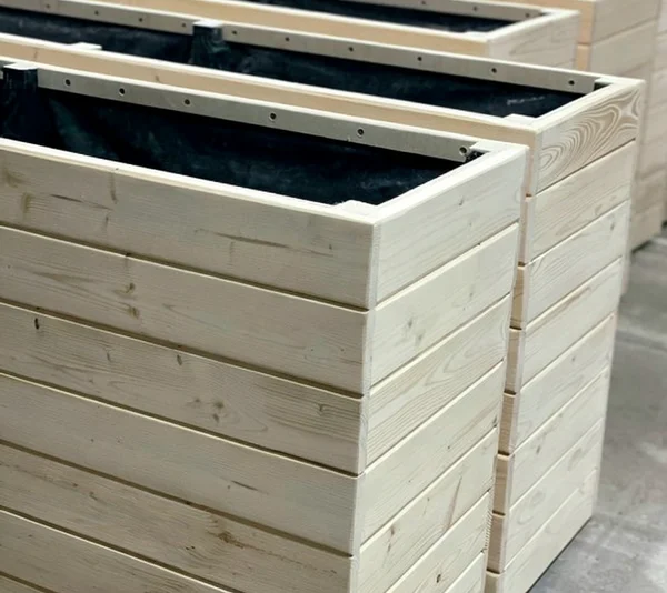В качестве материала выступает сухая доска 22 мм с фаской, пропитанная защитными средствами от огня, плесени и вредителей. Цветочница может быть окрашена в любой цвет. Производство выполняется в любых масштабах в заданном количестве. Все используемые материалы – экологически чистые, первого сорта.