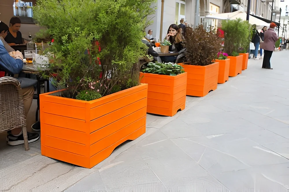 Прямоугольное напольные кашпо из дерева - прекрасный способ зонирования веранды летних кафе, отделяя столики и отдыхающих людей от загазованной проезжей части. Горизонтальные доски 40х100мм декорированы небольшим вырезом на нижней планке. Материал используется только 1 сорта, хорошо пропитан фирменными антимикробными и огнезащитными составами.