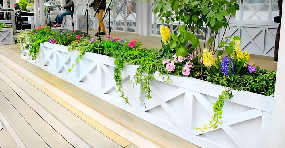 Большое уличное кашпо для декорирования урбанистических городских ландшафтов. Универсальный размер — 800 х 300 х 300 мм, для окрашивания по желанию заказчика предлагается палитра фирменной лессирующей защитной пропитки. X-образный декор по боковым стенкам из водостойкой фанеры.