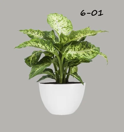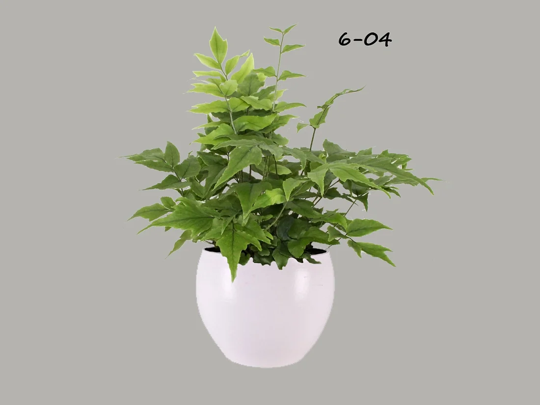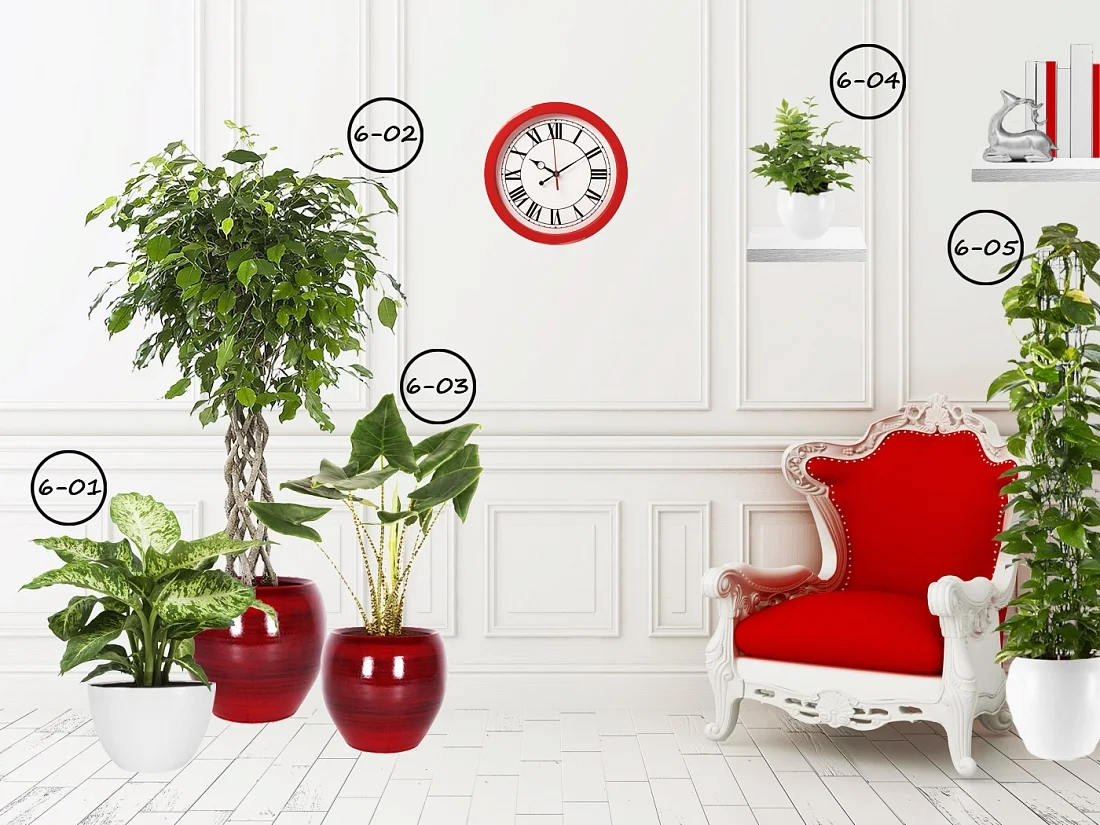 Идеален для помещений с белой отделкой. В комплекте представлены глянцевые кашпо из керамики и декоративно-лиственные растения разных форм.