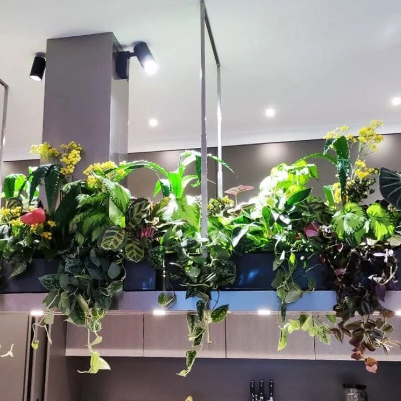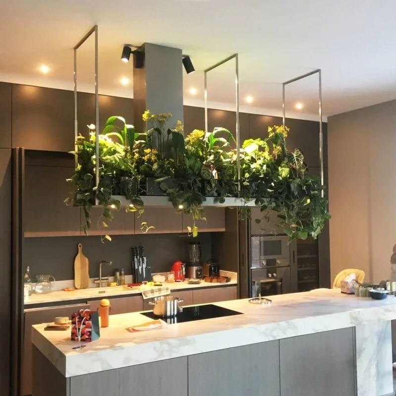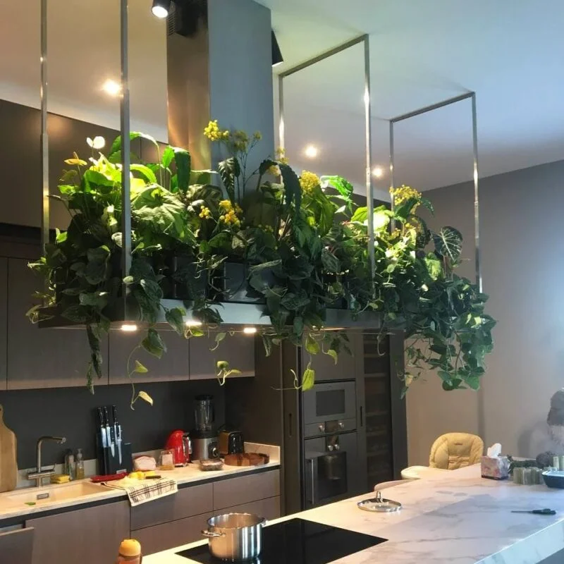 Композиции из живых и искусственных растений создают уют на кухне, не нуждаясь в сложном уходе. В проекте продуманы подвесные конструкции над зоной готовки и у окна. Учтены особенности и условия содержания цветов.