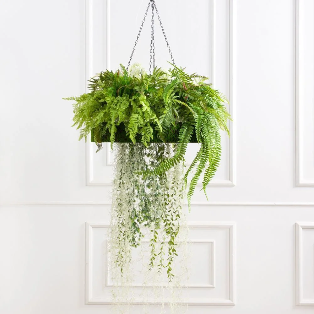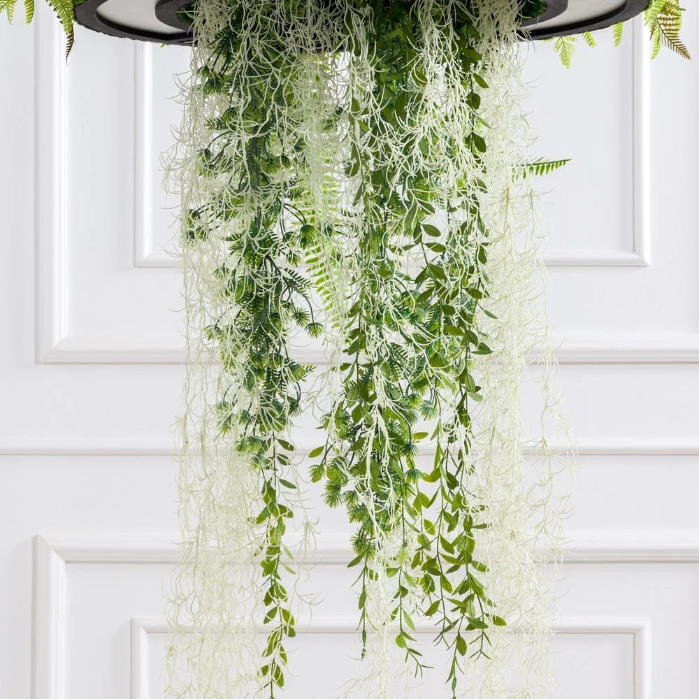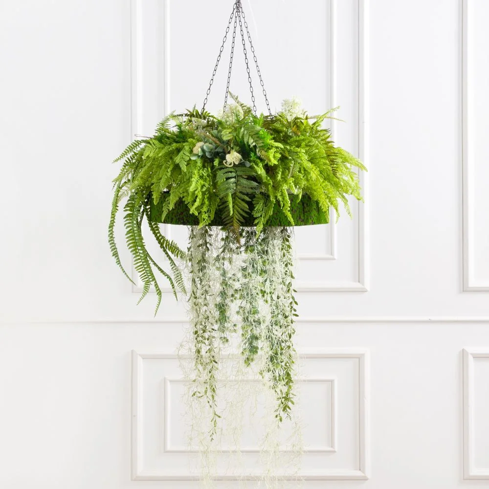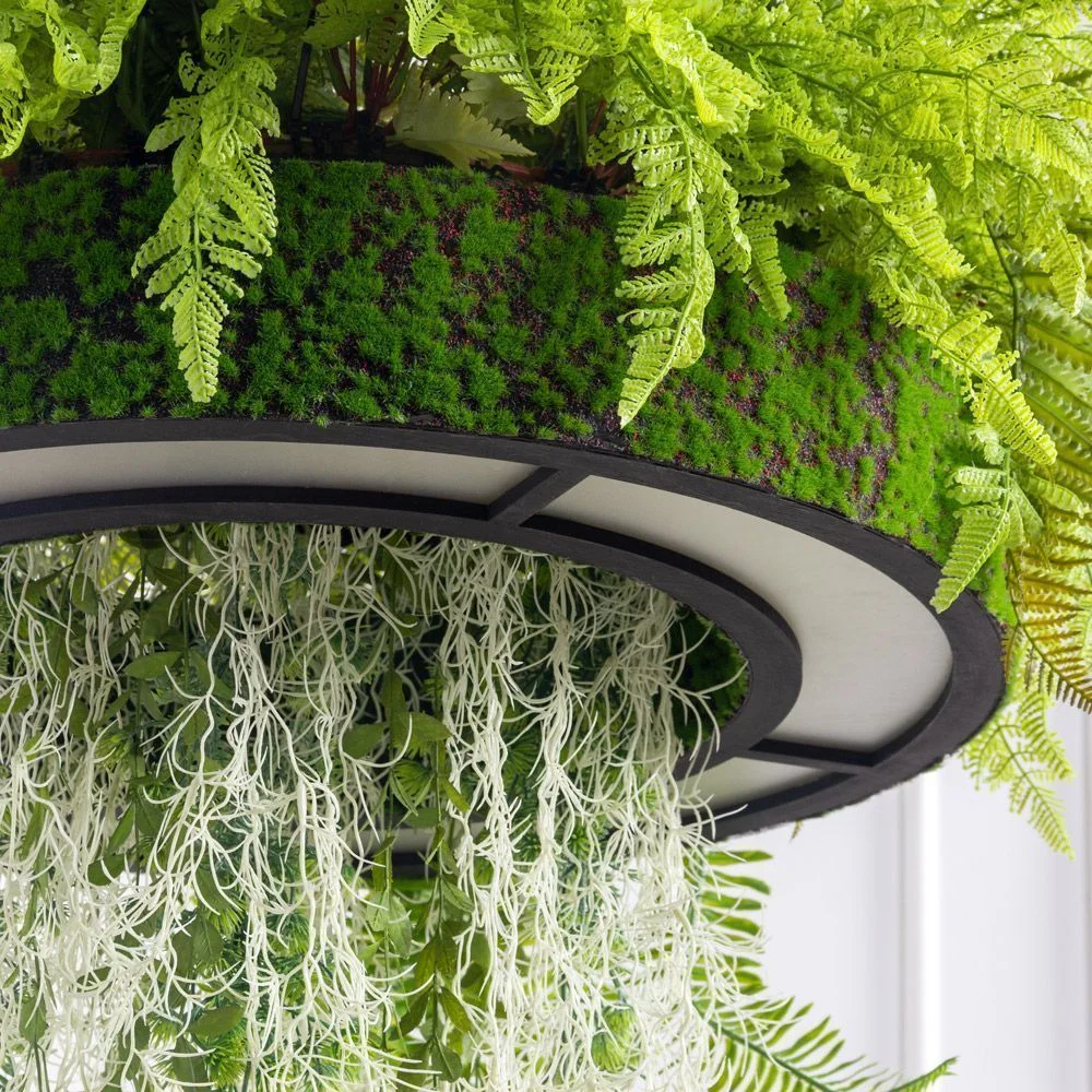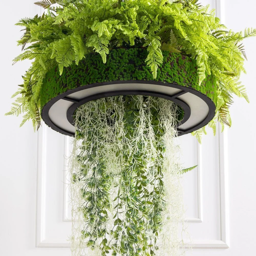 Ампельные растения в круглом светильнике станут ярким акцентом в интерьере. Они не только создадут точечное освещение, но и украсят любую зону.