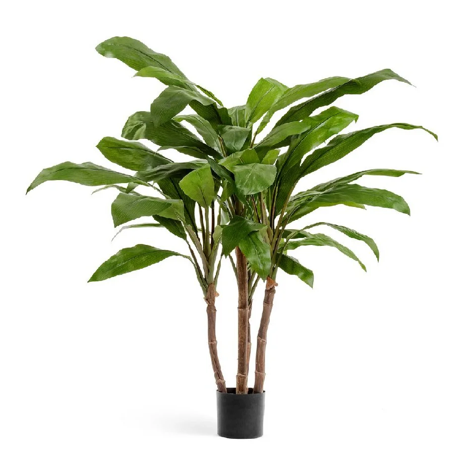 Кордилина зелёная крупнолистная, искусственная. У растения четыре ствола. Листья широкие, с разнообразным оттенком зелёного: одни светлее, другие темнее.