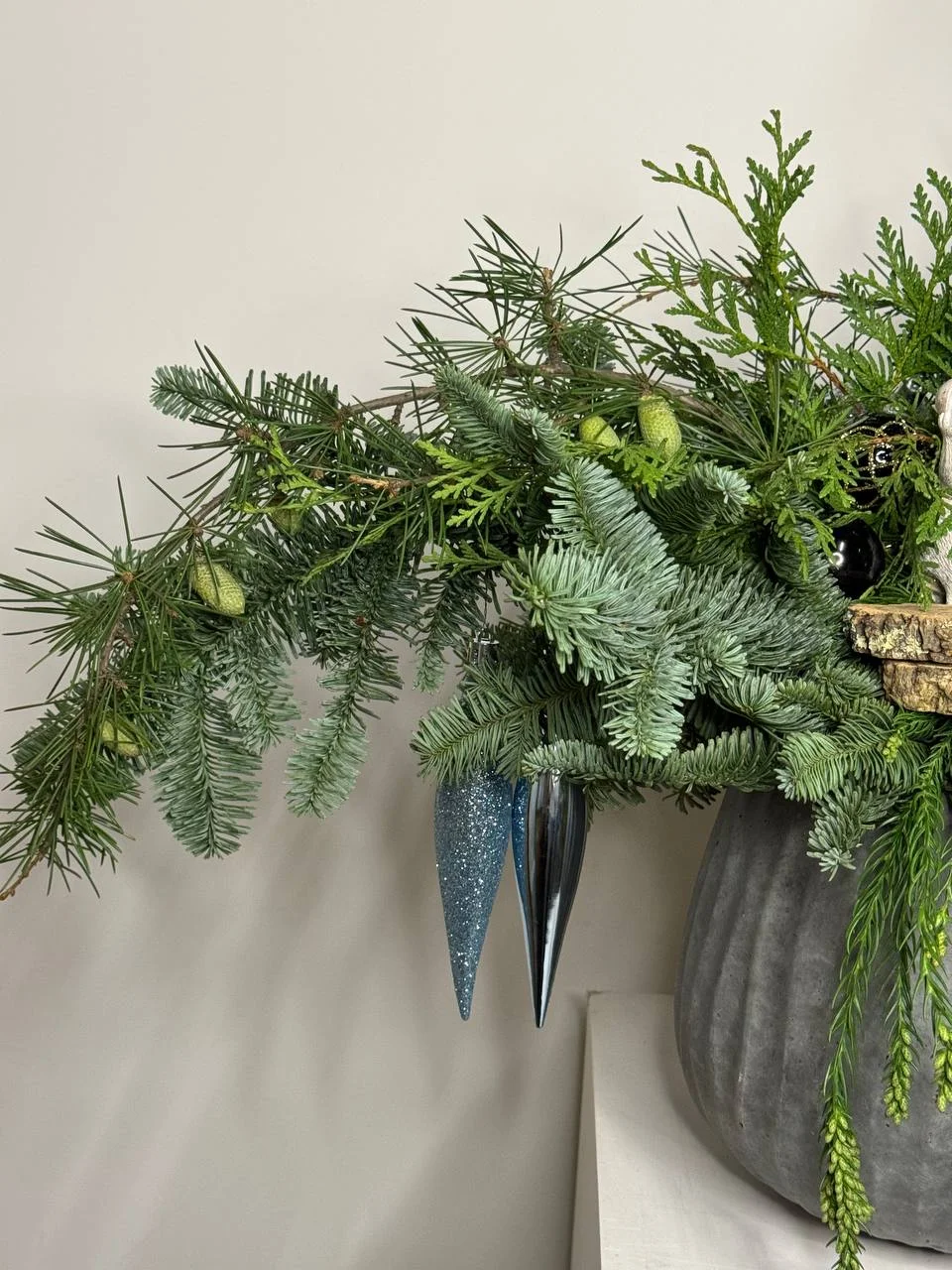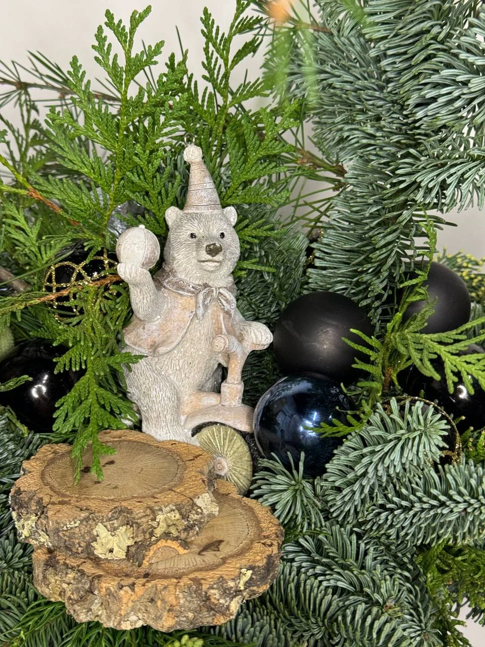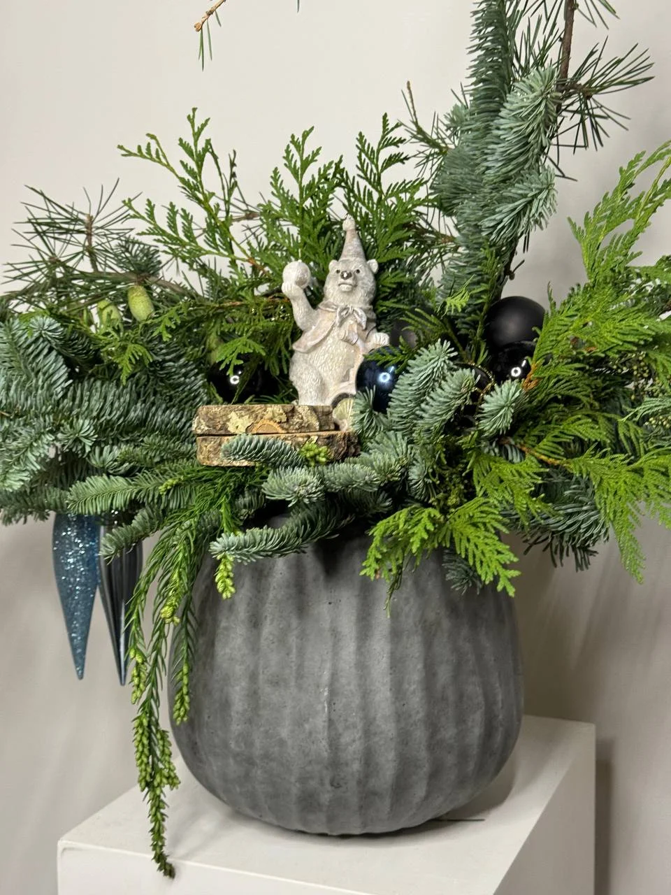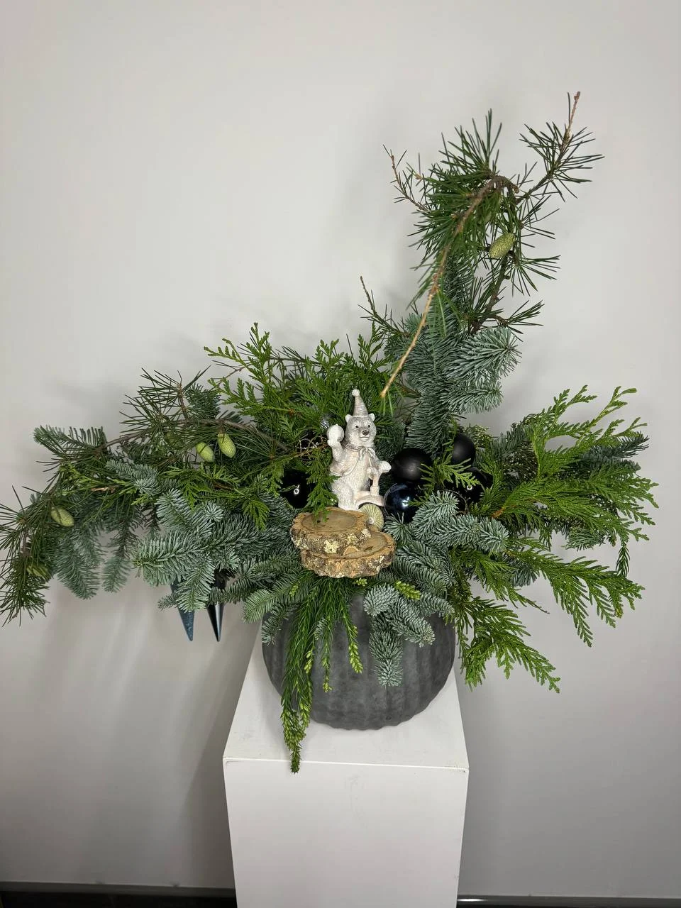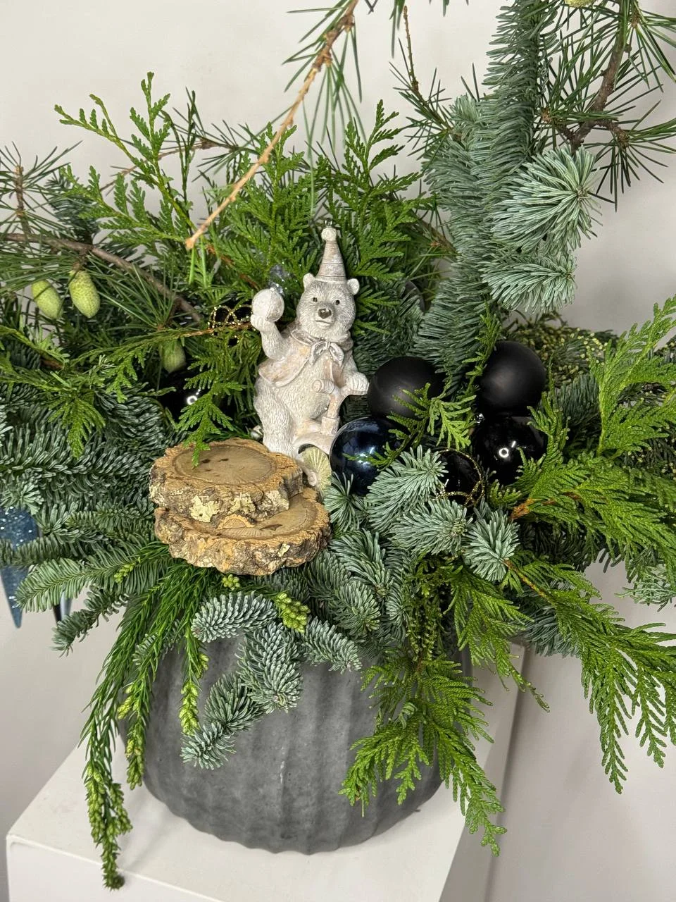 Композиция из живой хвои. Декоративная работа, состоящая из разных хвойных веток, помещена в серое кашпо. Ветки украшены черными и зелеными шарами. В центре композиции стоит небольшая фигурка.