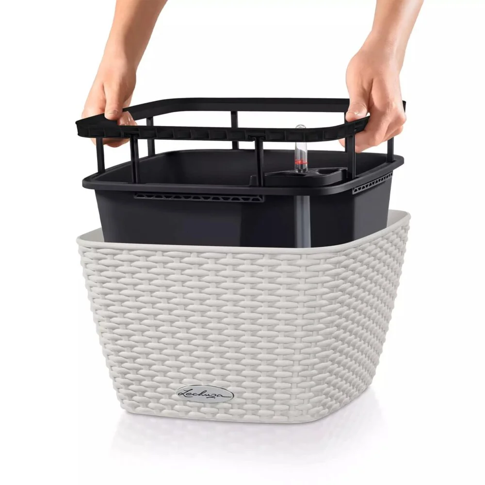 BACINO Cottage – настольное кашпо с системой автополива, с помощью которого вы сможете эффектно дополнить интерьер или пространство на улице. Кашпо изготавливаются в Германии. Поверхность кашпо имеет плетеную фактуру. За свой стильный внешний вид кашпо было отмечено премиями GOOD DESIGN и Designpreis. Материал, из которого сделано кашпо, – это высококачественный ударопрочный пластик, который не пахнет и не выгорает. Кашпо не боится перепадов температур и защищено от перелива дождевой воды.