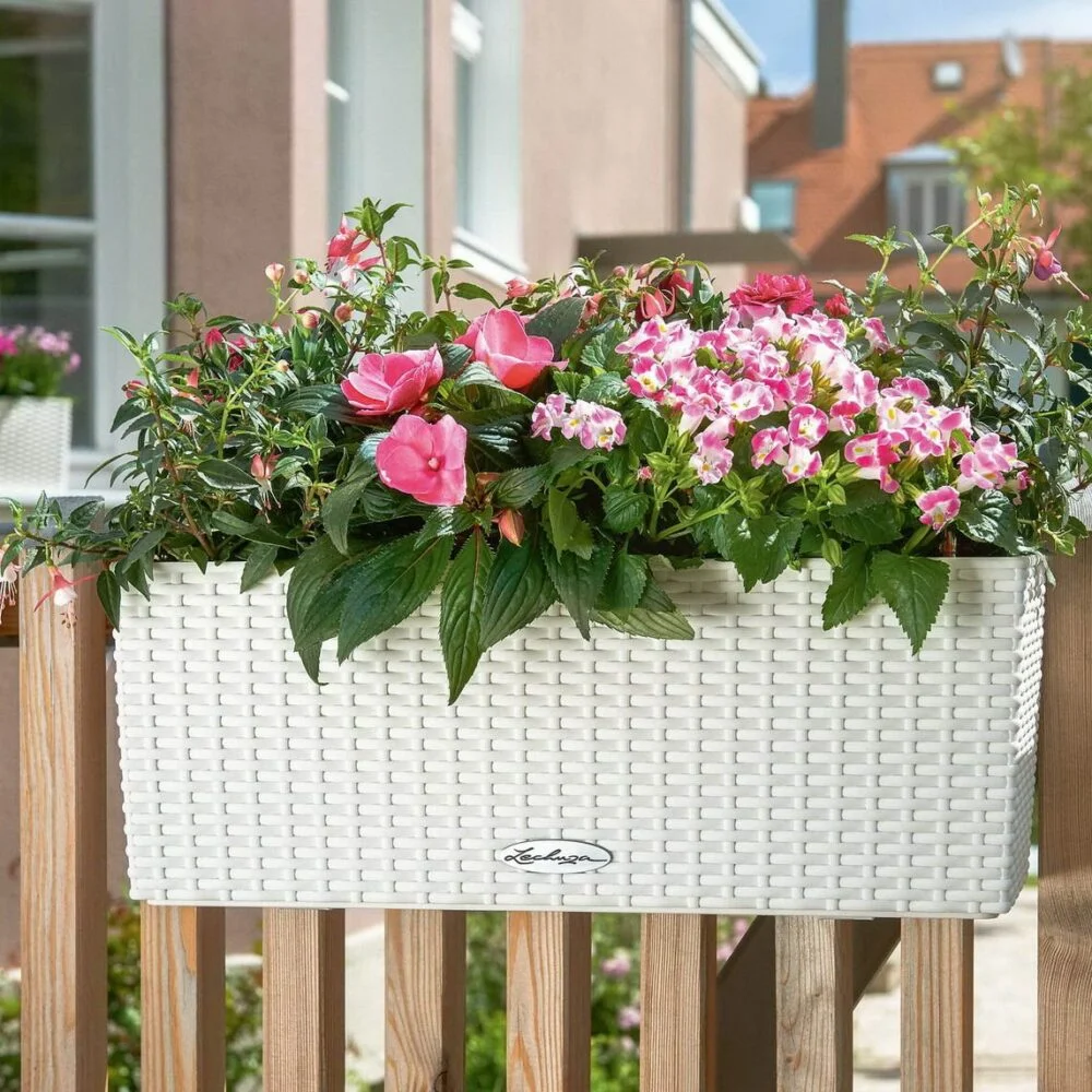 Кашпо BALCONERA – немецкое кашпо с системой автополива, которое вы можете закрепить на перилах балкона или террасы, а также поставить на стол или подоконник. Кашпо обладает поверхностью с фактурой “под камень”, сделано из высококачественного ударопрочного пластика, который не пахнет и не выгорает. Кашпо защищено от перелива дождевой воды.