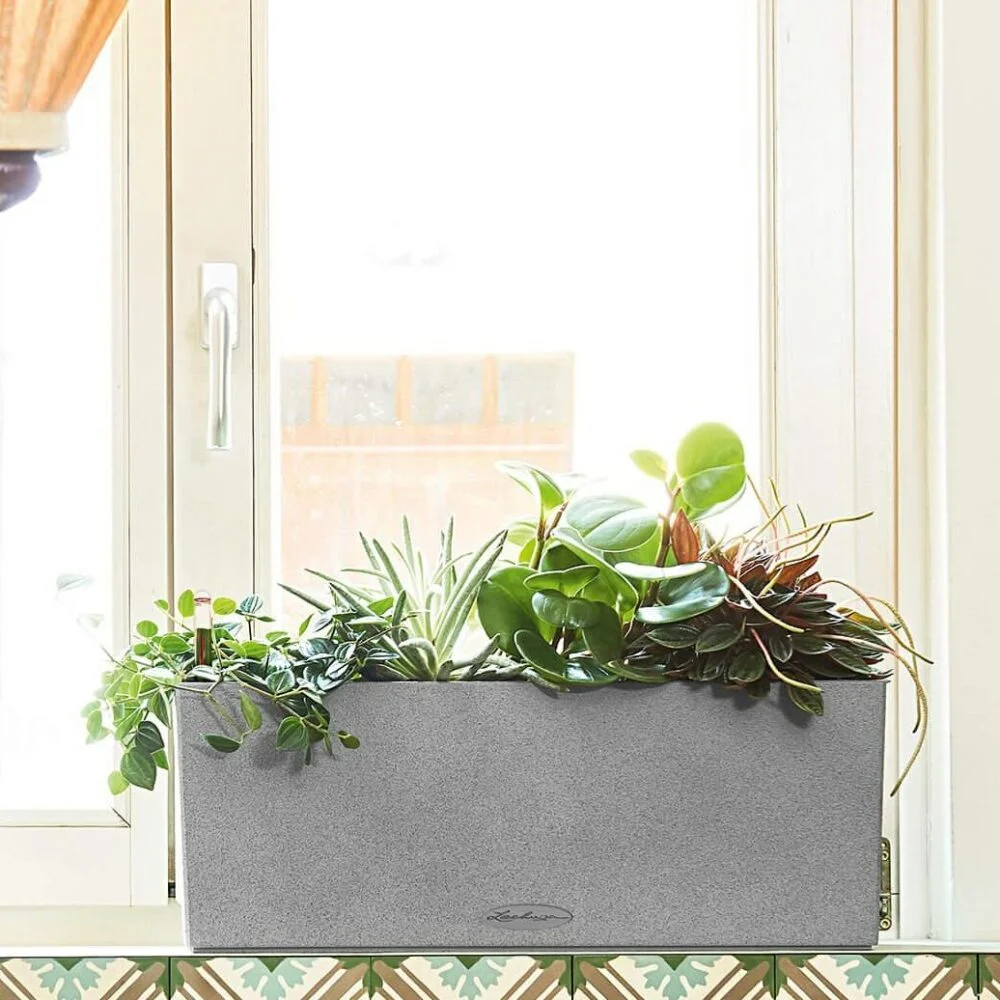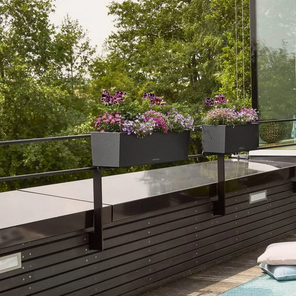 Кашпо BALCONERA – немецкое кашпо с системой автополива, которое вы можете закрепить на перилах балкона или террасы, а также поставить на стол или подоконник. Кашпо обладает поверхностью с фактурой “под камень”, сделано из высококачественного ударопрочного пластика, который не пахнет и не выгорает. Кашпо защищено от перелива дождевой воды.