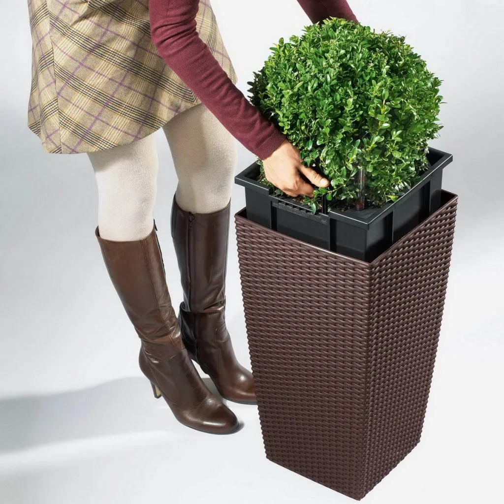 CUBICO Cottage – напольное кашпо с системой автополива, с помощью которого вы сможете эффектно дополнить интерьер или пространство на улице. Кашпо изготавливаются в Германии. Поверхность кашпо имеет плетеную фактуру. За свой стильный внешний вид кашпо было отмечено премиями GOOD DESIGN и Designpreis.Материал, из которого сделано кашпо, – это высококачественный ударопрочный пластик, который не пахнет и не выгорает. Кашпо не боится перепадов температур и защищено от перелива дождевой воды.
