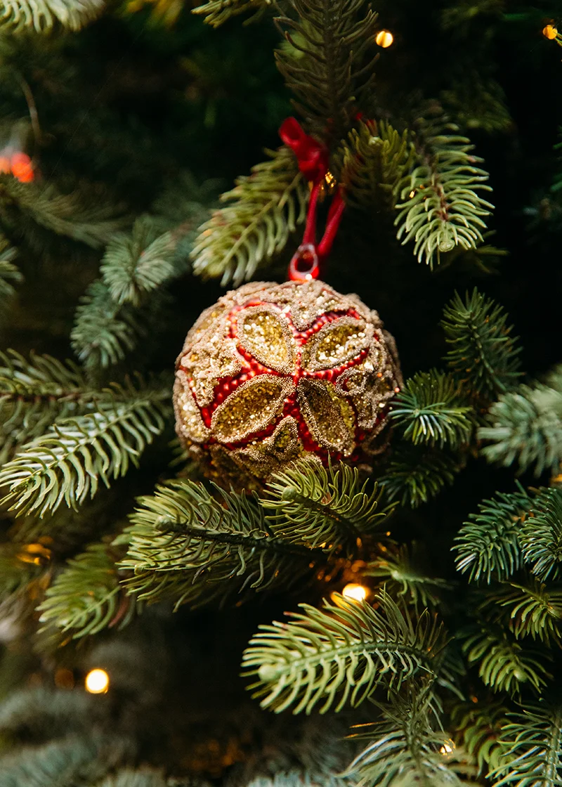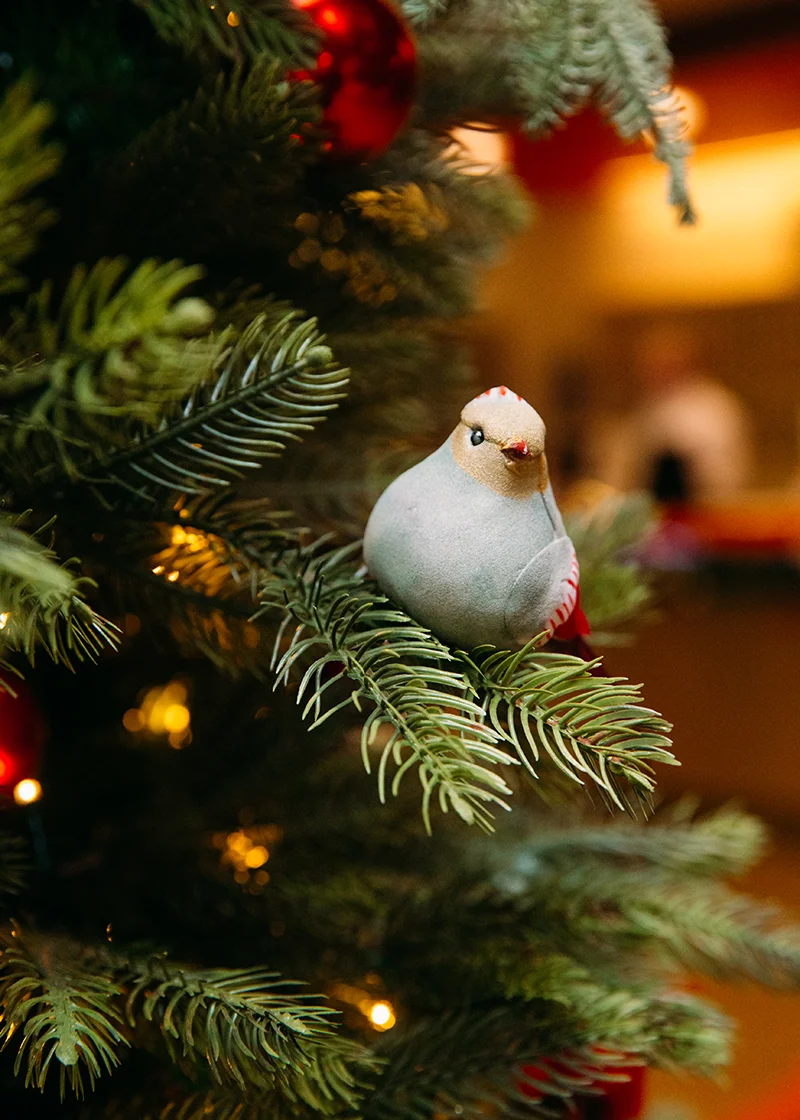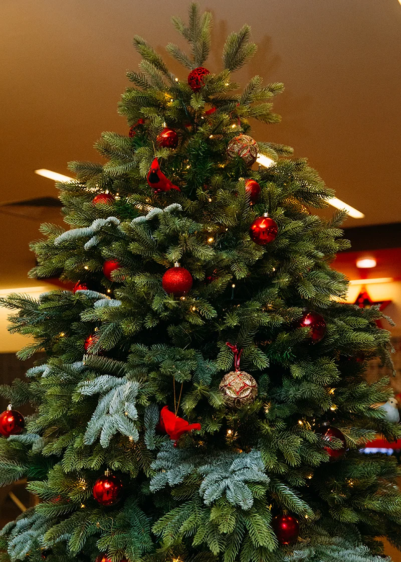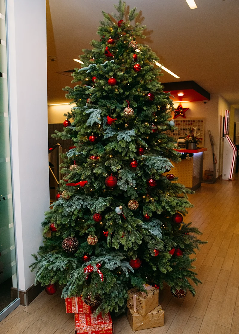 Чтобы сделать праздник ярче, мы украсили искусственную ель живыми еловыми ветками.