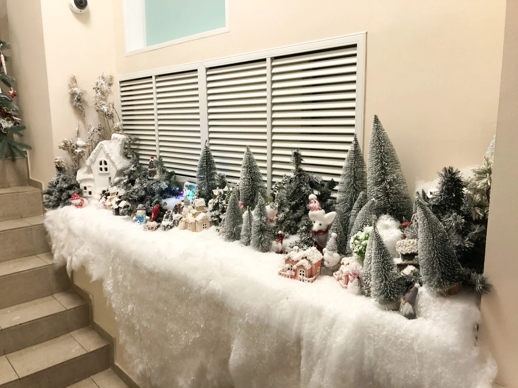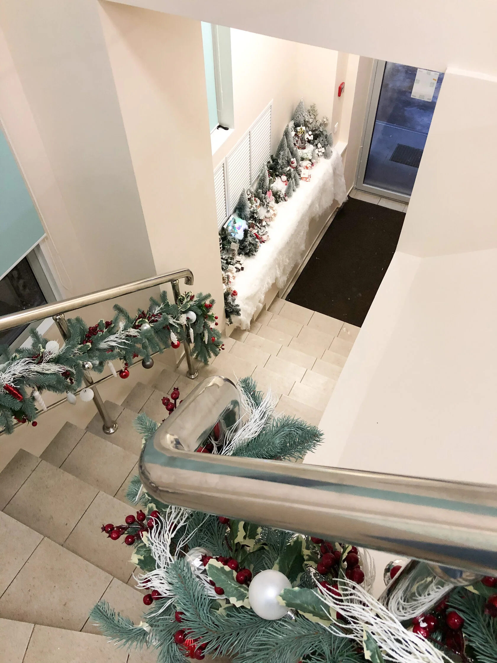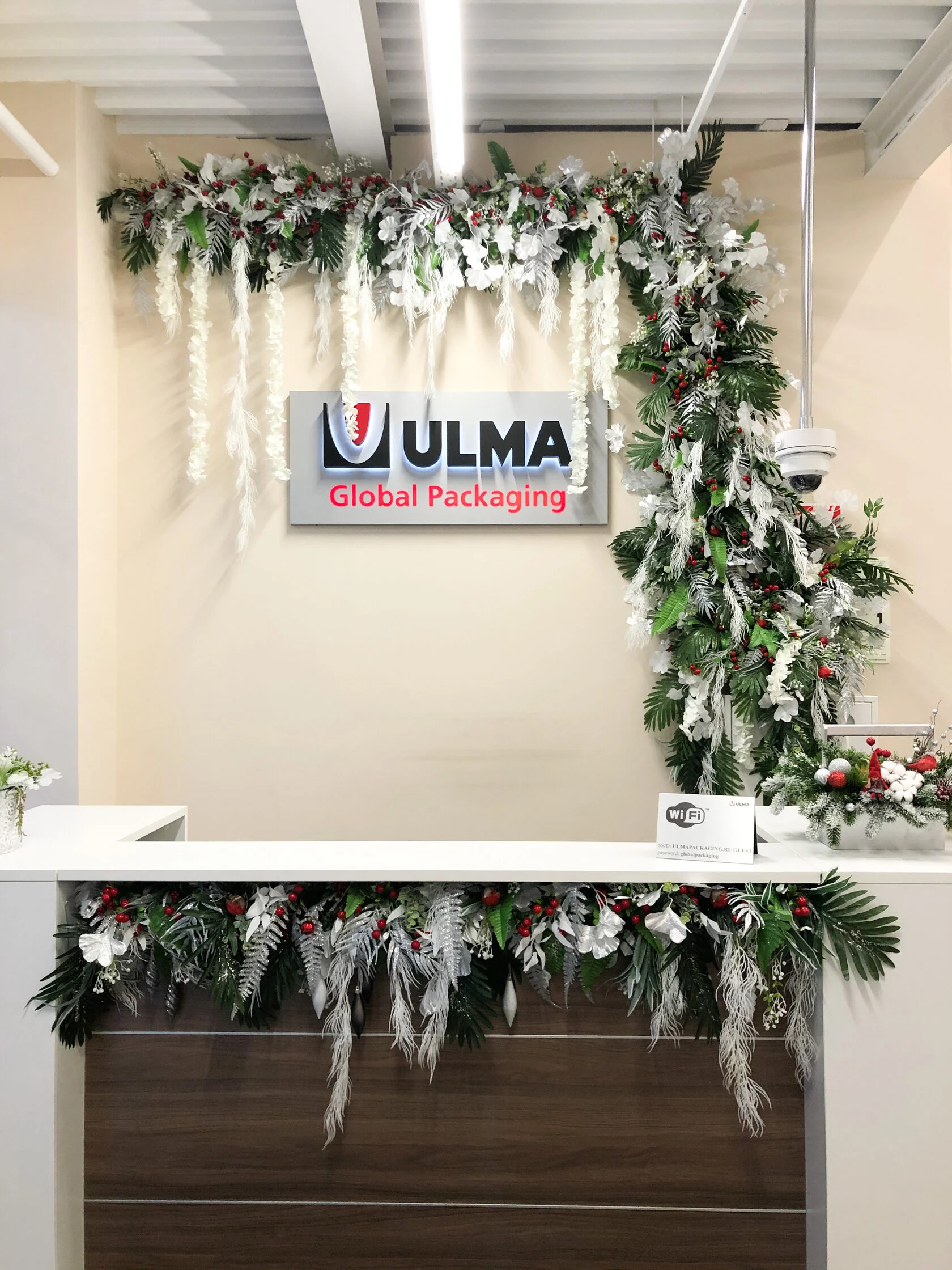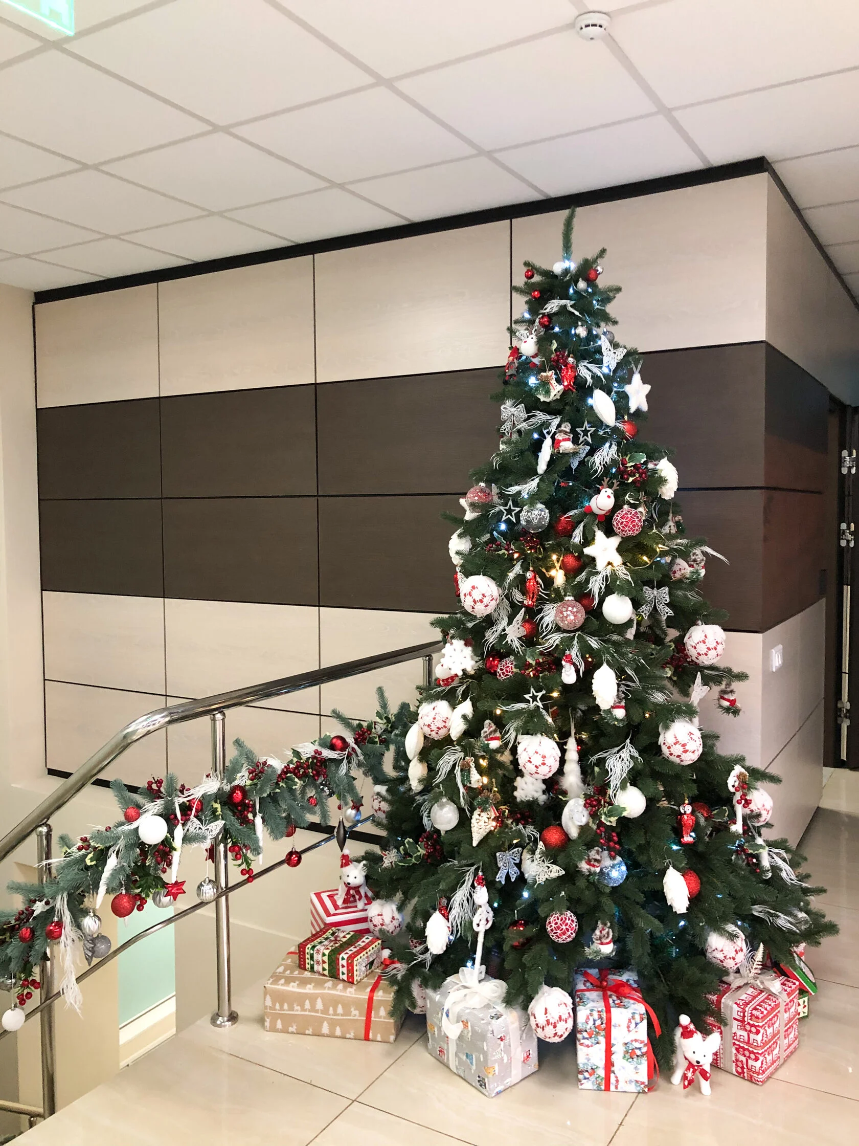 Сотрудники и клиенты компании окунулись в праздничную атмосферу с самого входа. Декораторы установили на лестнице елочную гирлянду с новогодними шарами, создали снежный городок, оформили два ресепшена и украсили главную елку в офисе.