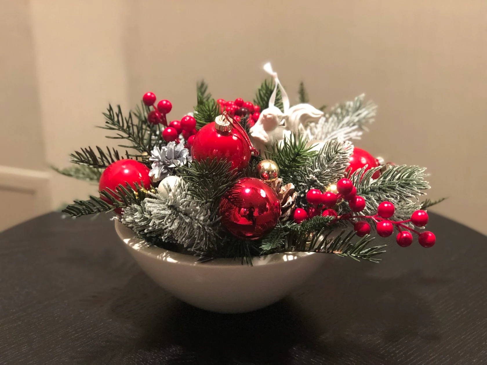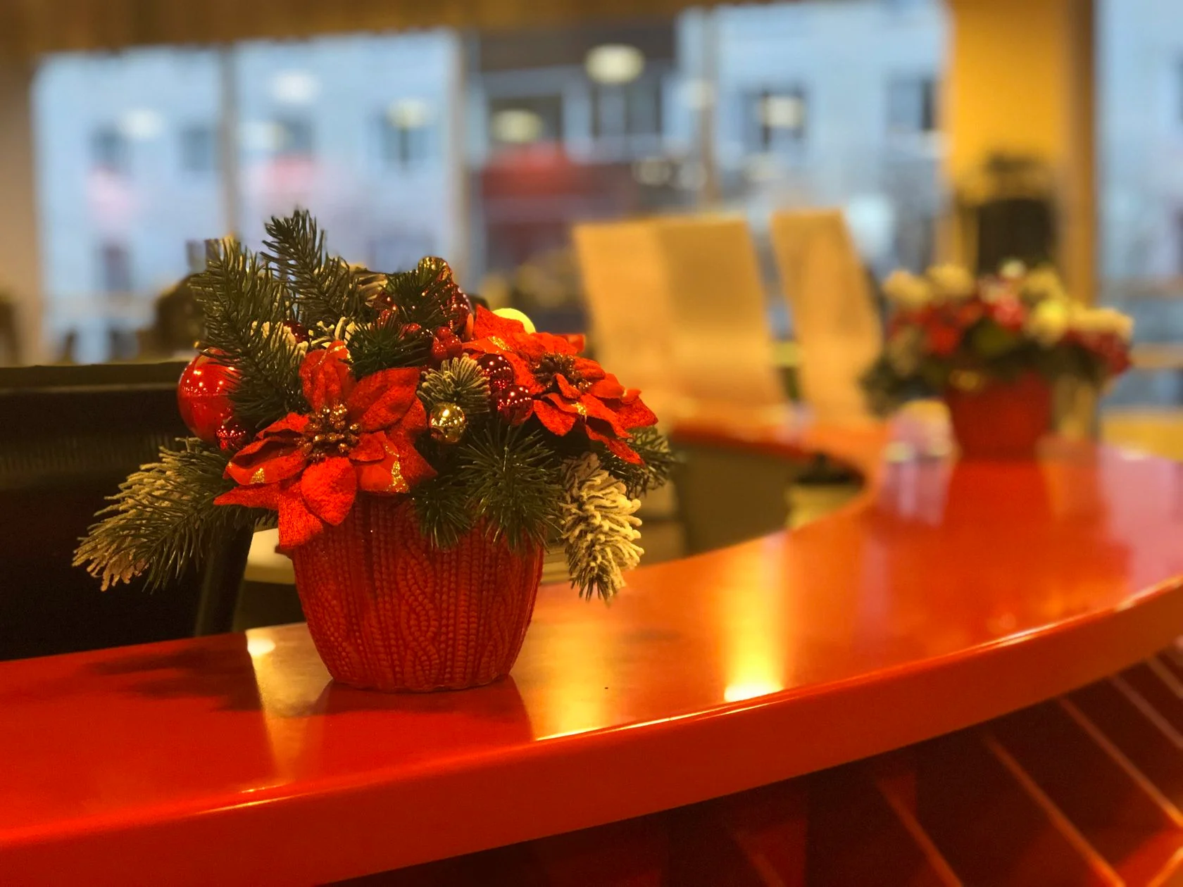 По периметру всего клуба расставлены зимние композиции, изготовленные нашими флористами под заказ.