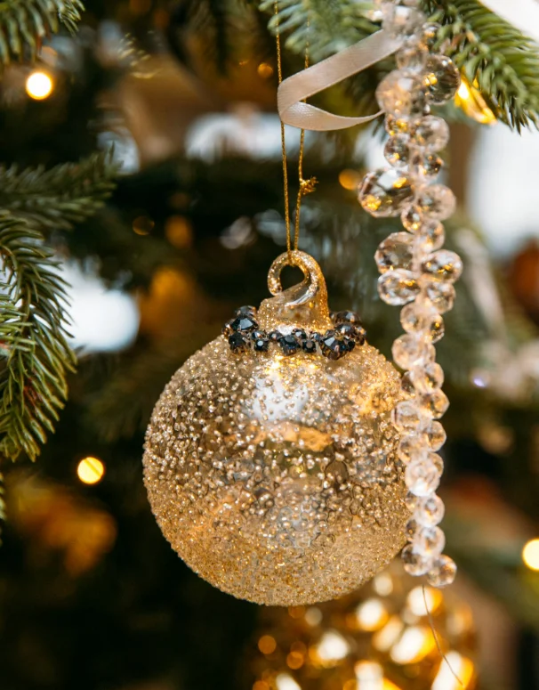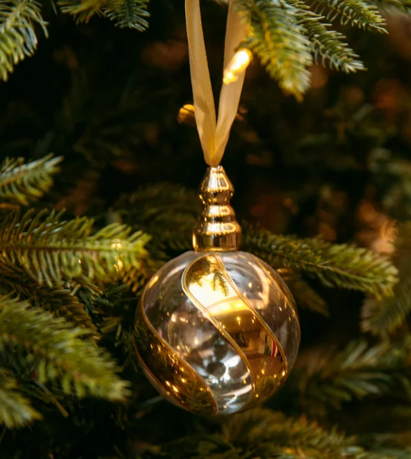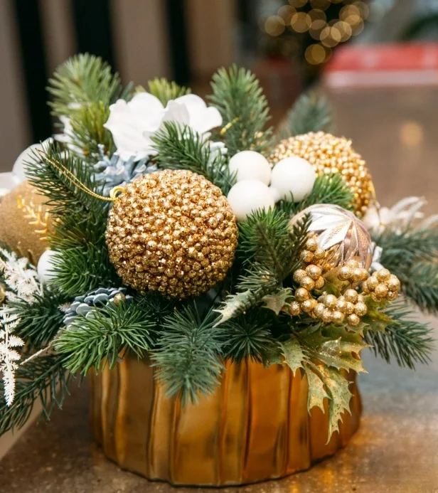 Для оформления фитнес-клуба мы применили ель из литой хвои со встроенными световыми гирляндами, новогодние игрушки и украшения золотых оттенков.