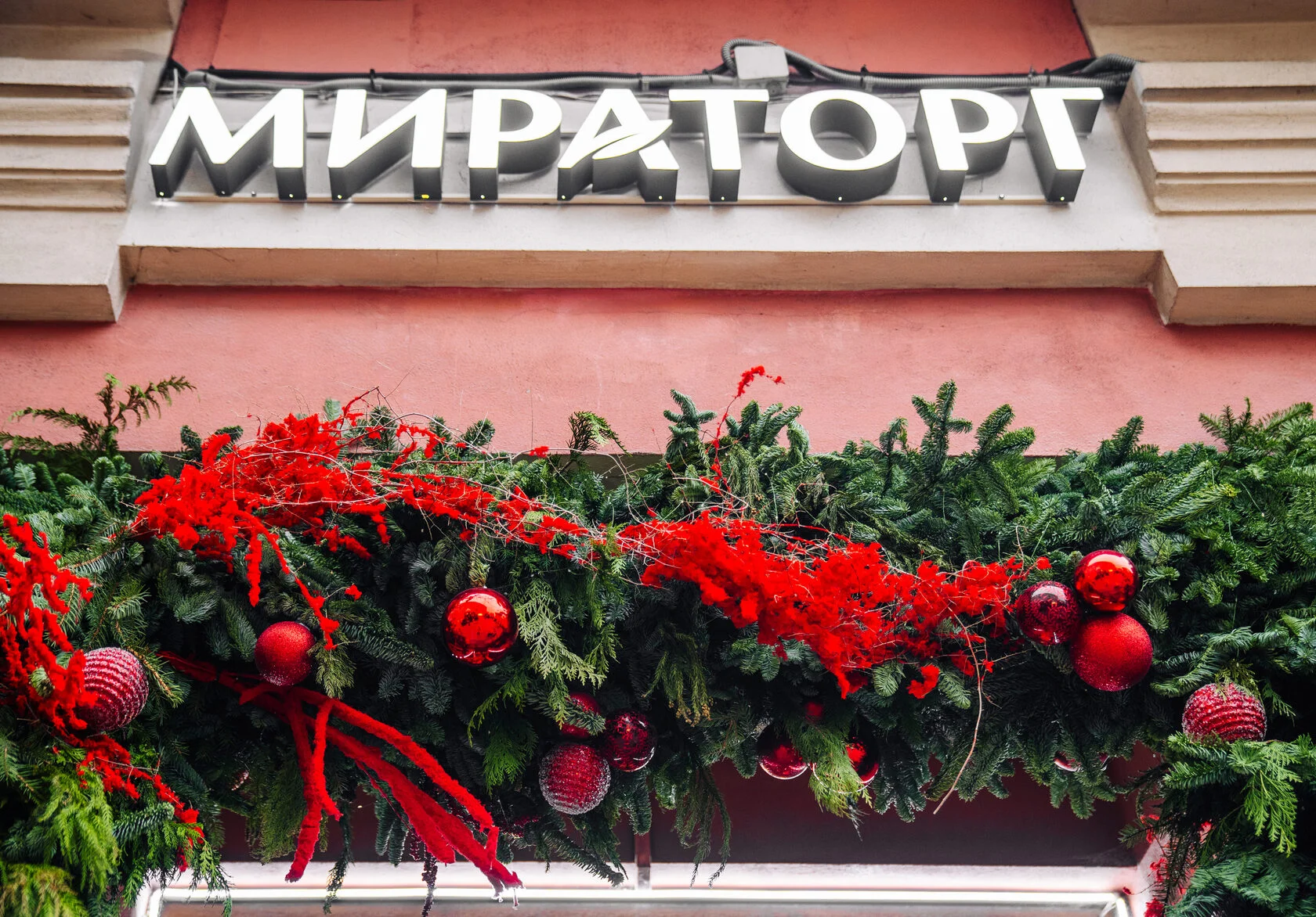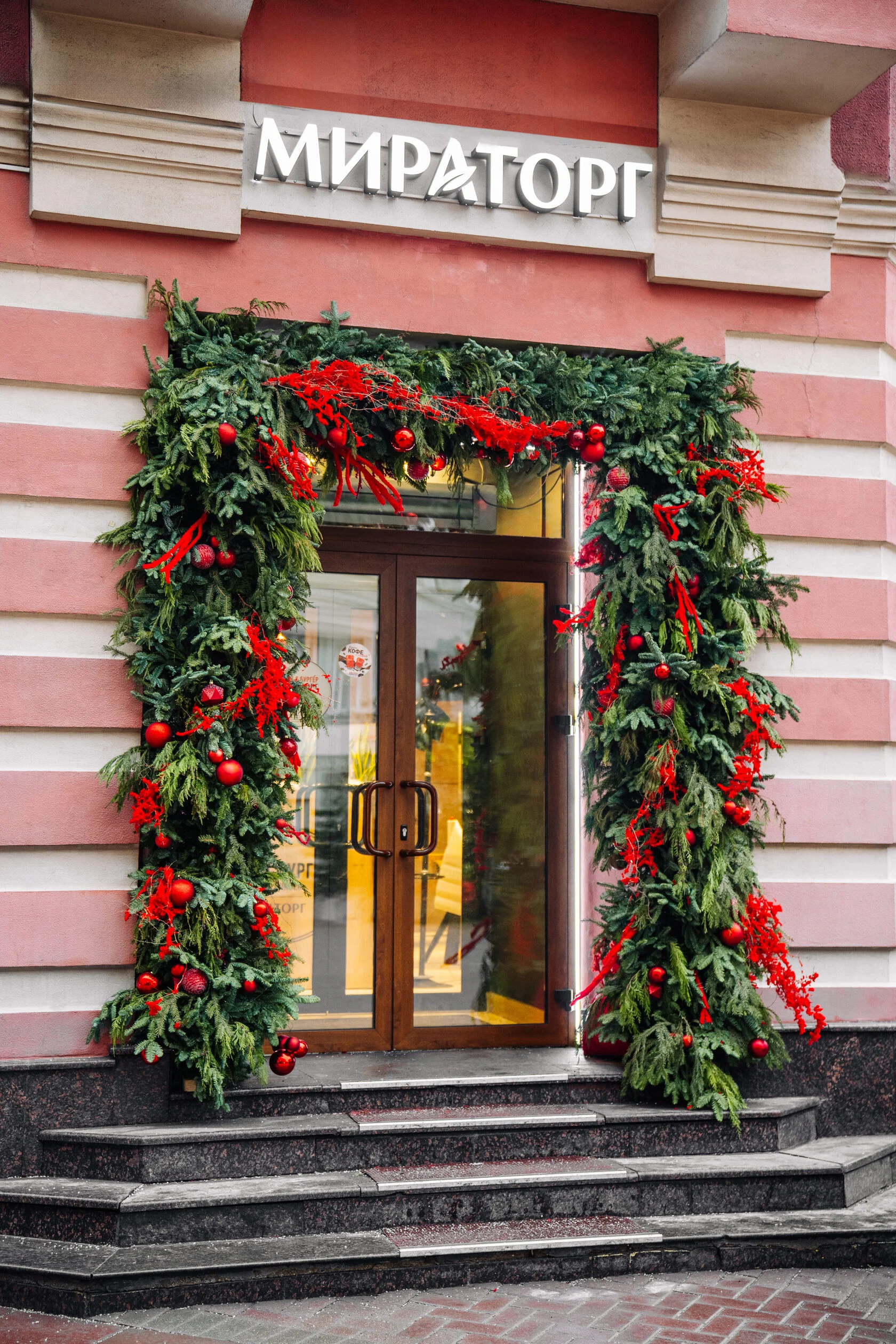 Создать быстрое и эффектное новогоднее оформление фасада кафе. Необходимо было разработать коммерческое предложение и реализовать оформление входной зоны с акцентом на красном цвете в соответствии с фирменным стилем компании.