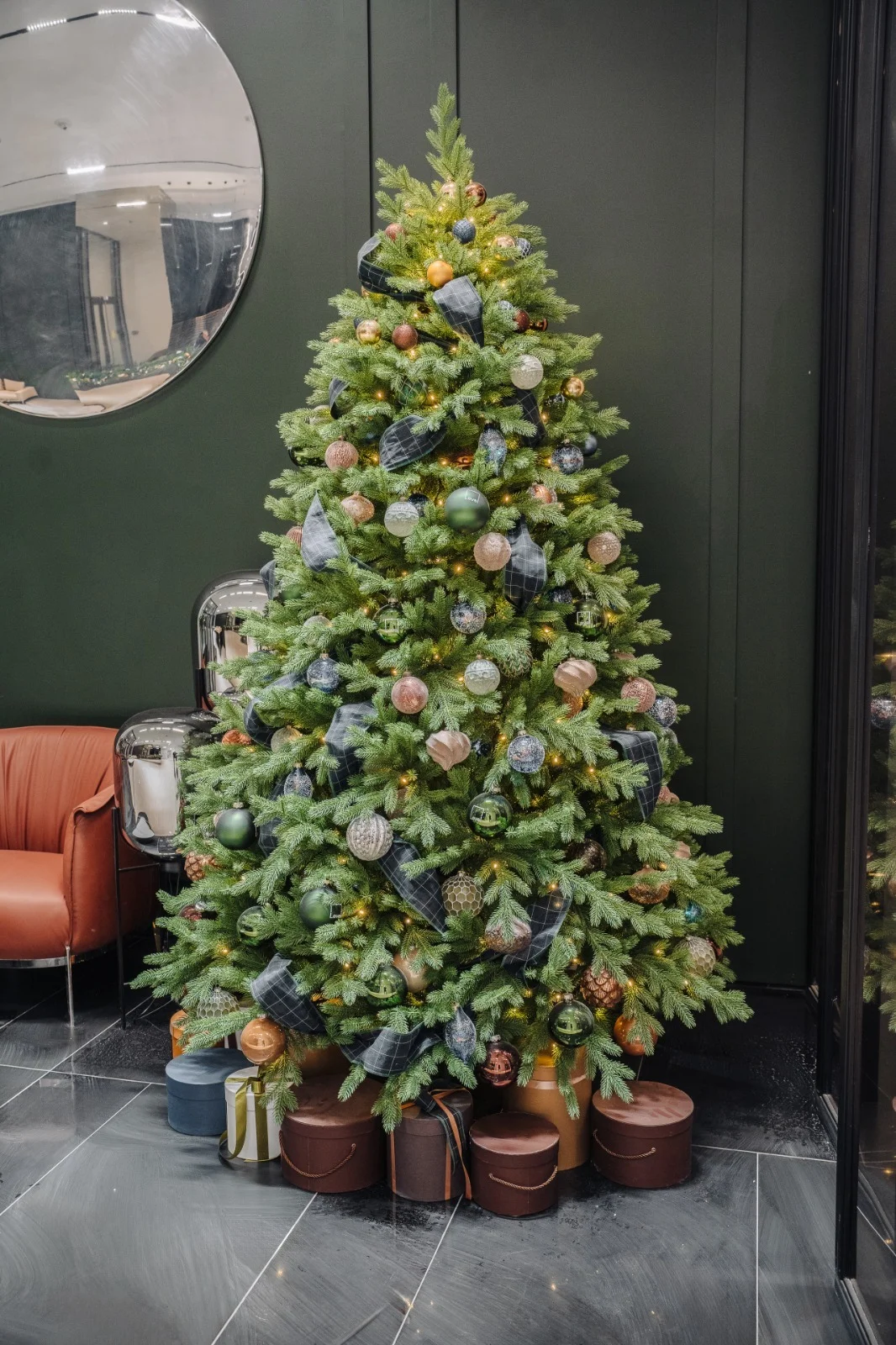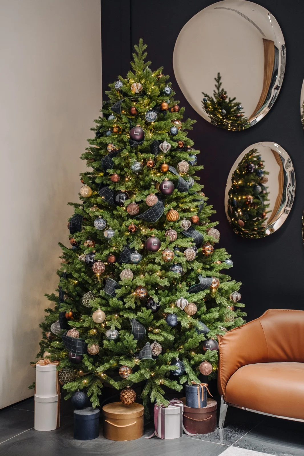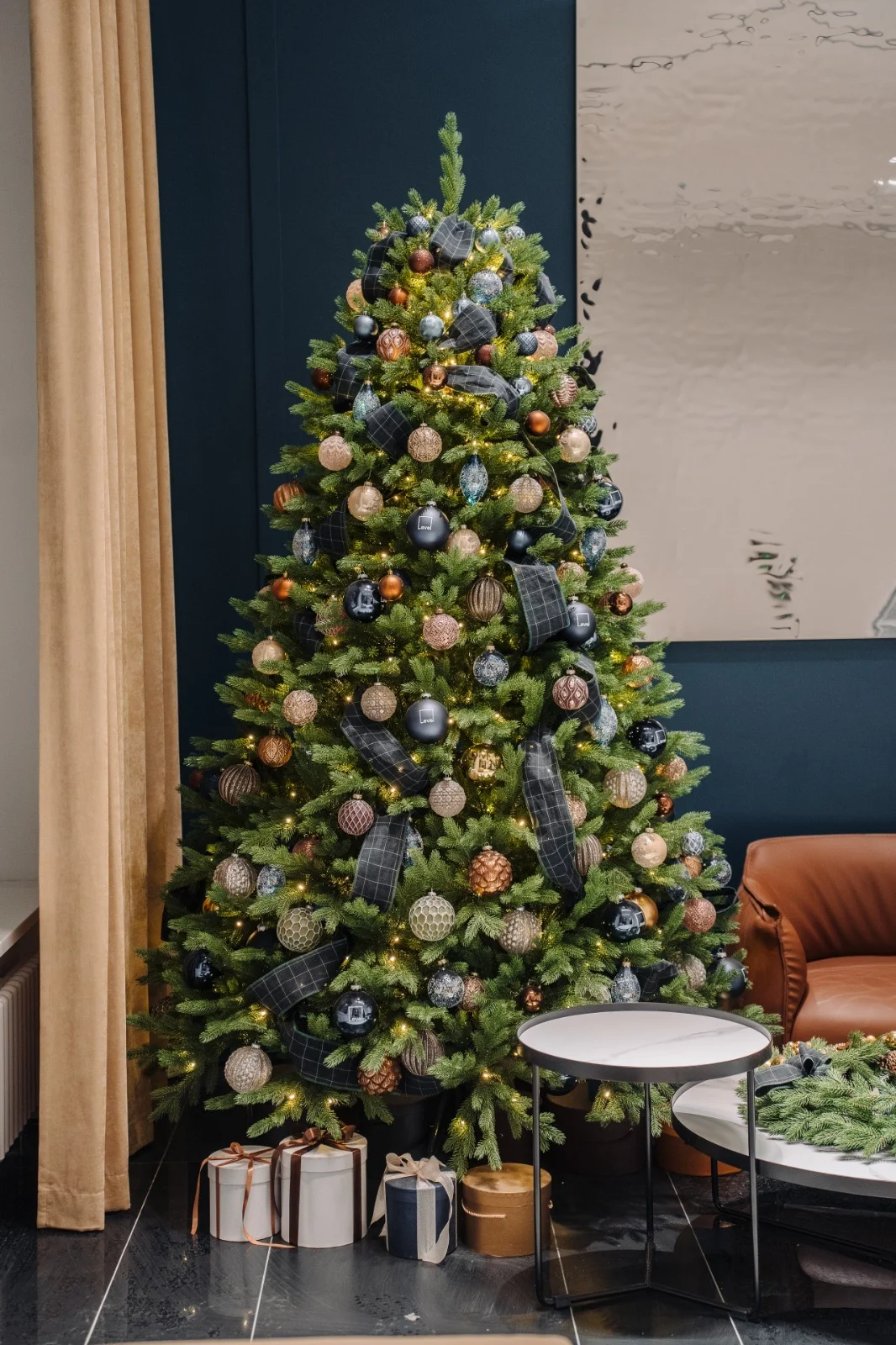 Эта ель — воплощение утонченного стиля. Каждая её составляющая сверкает, как драгоценный камень, наполняя пространство атмосферой торжественности и изысканности.