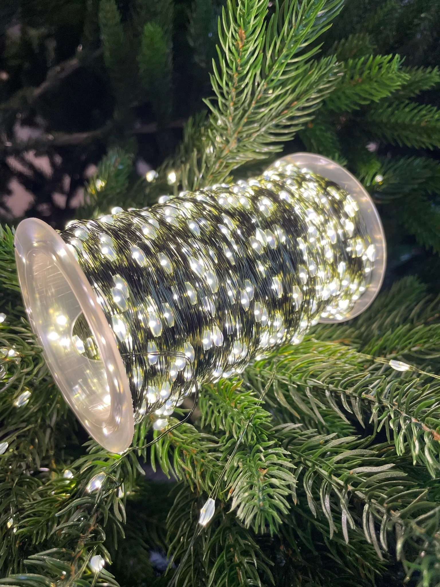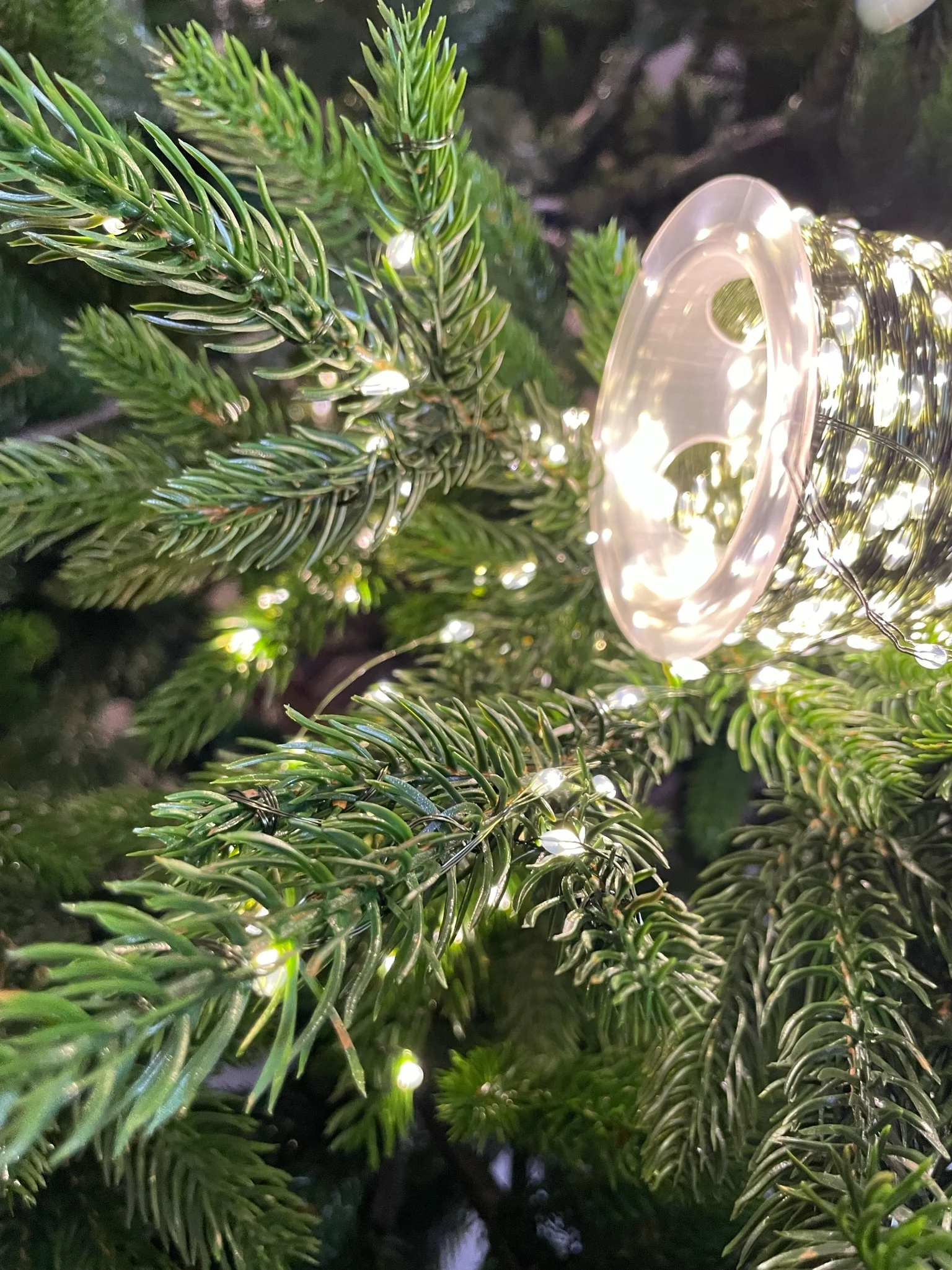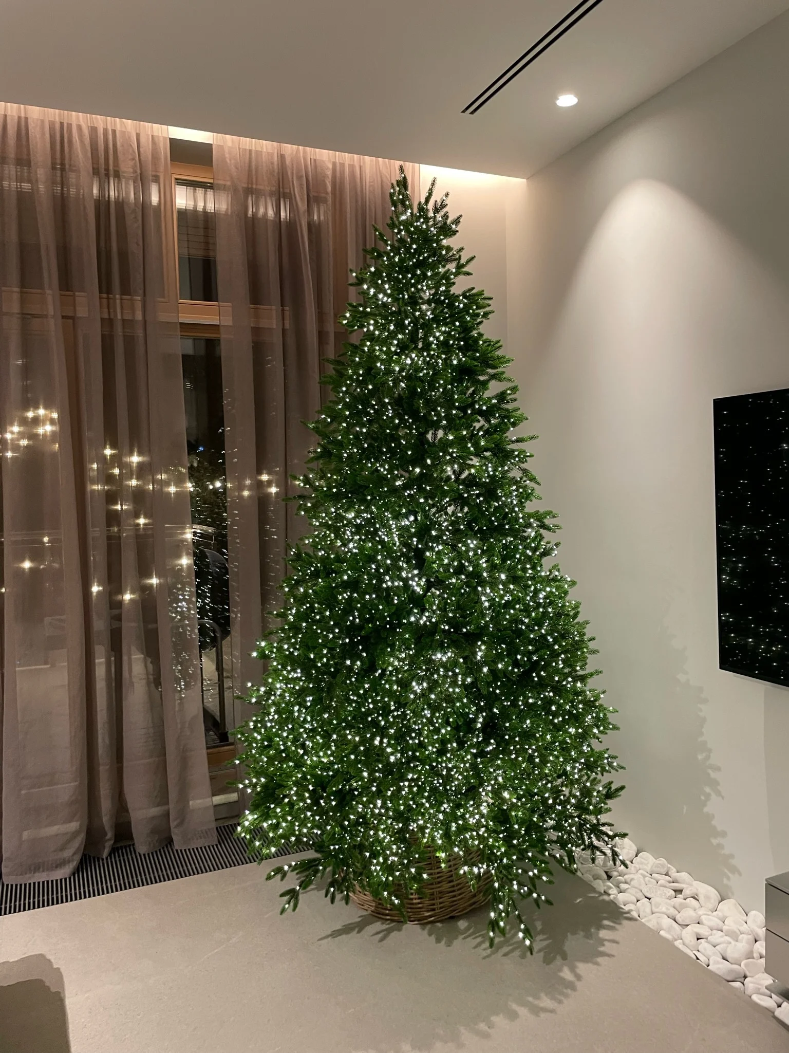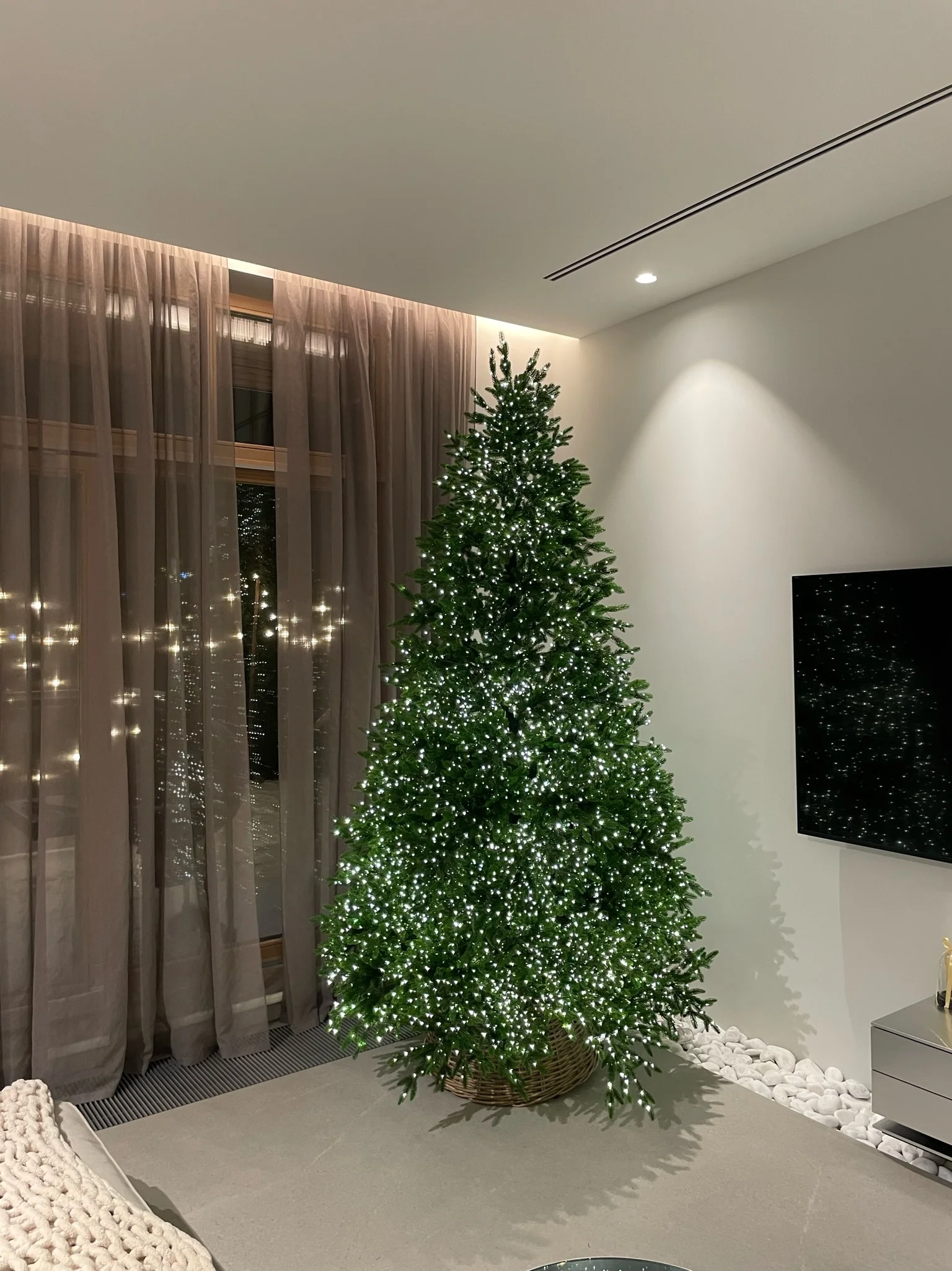 Ель словно окутана звёздным светом. Её тёмно-зелёные ветви украшены гирляндой, напоминающей капли росы. Элегантная и таинственная, она создаёт атмосферу уюта, стиля и праздничного волшебства.