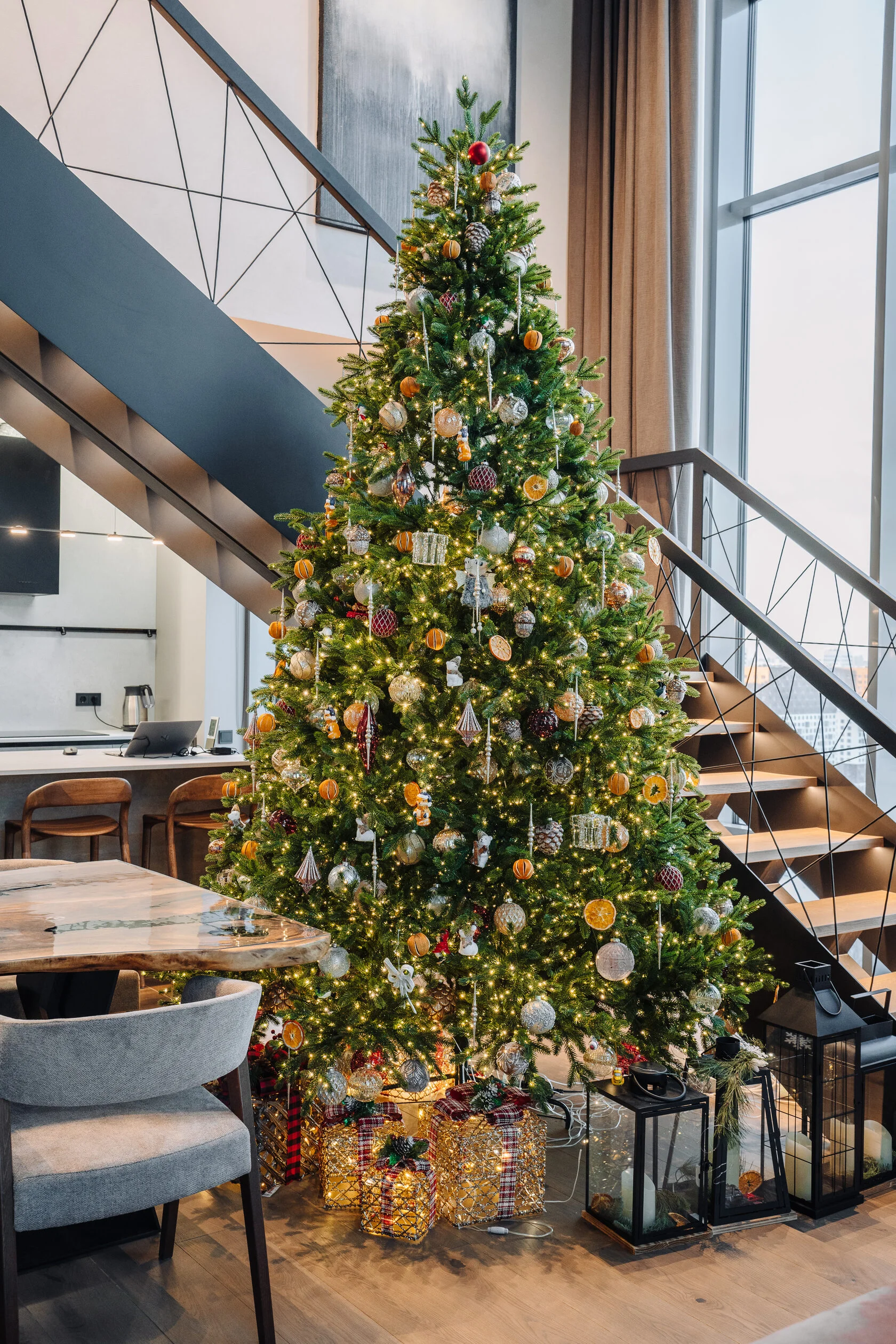 Эта ель словно создана, чтобы вернуть в дом атмосферу детских чудес и новогодней магии. Её густая зелёная хвоя из литого материала мерцает встроенной гирляндой, наполняя пространство мягким сиянием. Изысканный набор игрушек из стекла и декоративные подарки под елью превращают интерьер в настоящий сказочный уголок, где каждый огонёк дарит тепло и надежду.