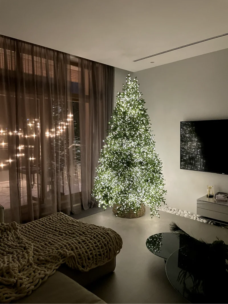В центре комнаты возвышается новогодняя ёлка, сверкающая тысячами маленьких огоньков. Её сияние и простота создают атмосферу уюта в этот зимний вечер.