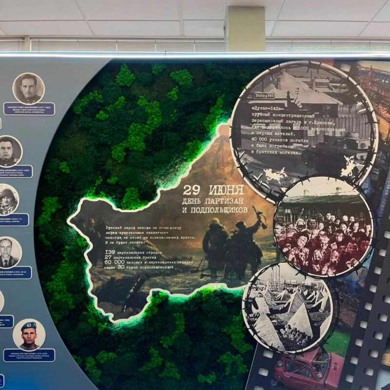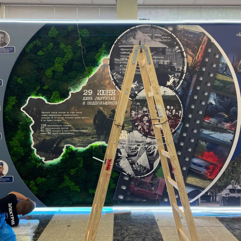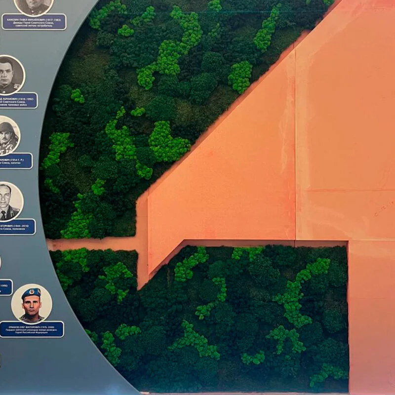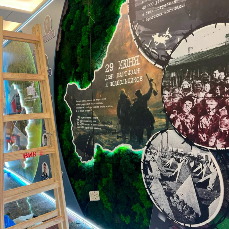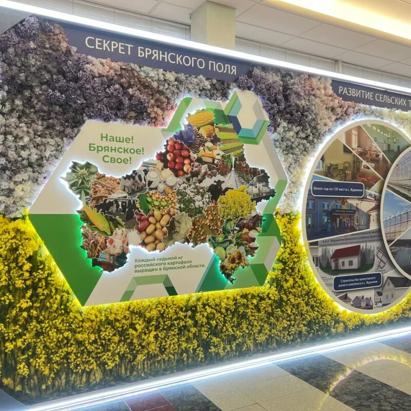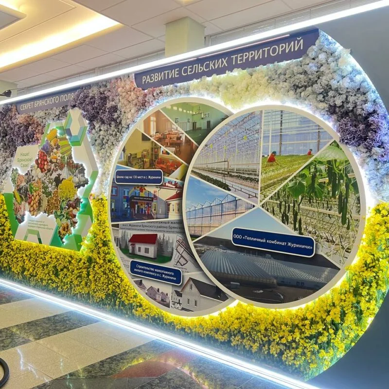 Использование стабилизированного мха для декора стенда на выставке региона России позволило создать эффектное оформление, которое привлекло внимание посетителей. Разные фактуры и цвета мха сделали экспозицию живой и запоминающейся. Для оформления стенда земледелия применялись яркие искусственные цветы.