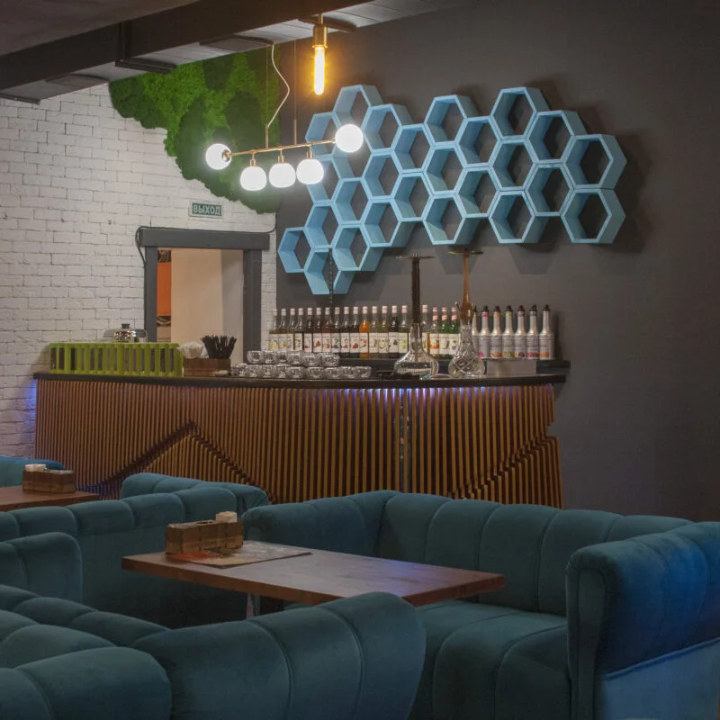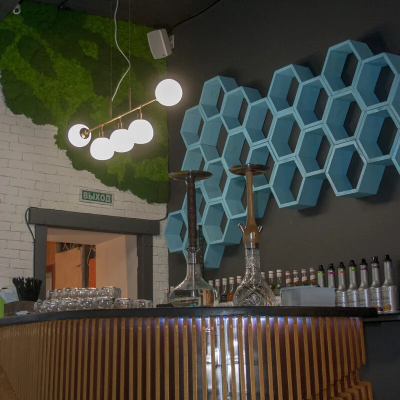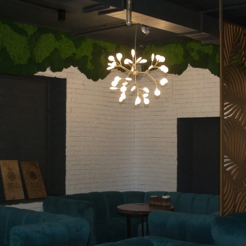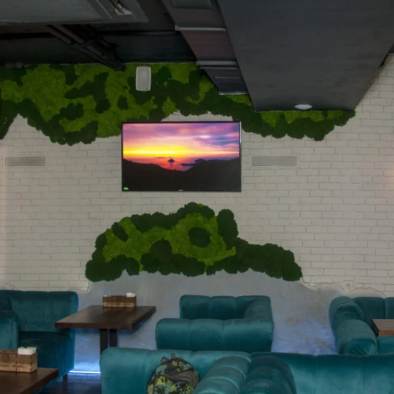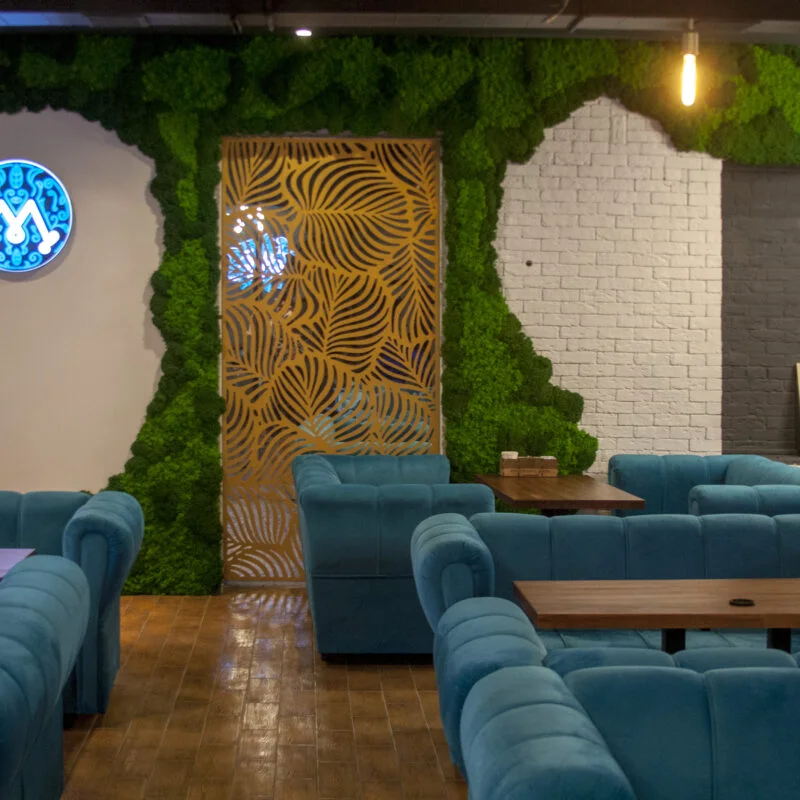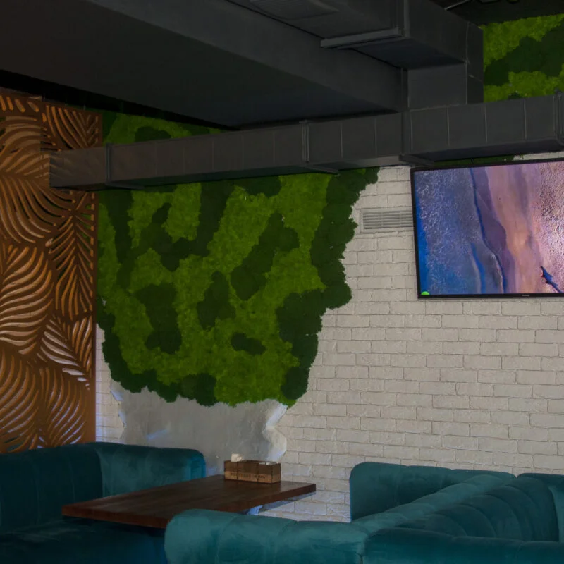 Для создания уютной и природной атмосферы в лаунж-пространстве использовали дизайнерские панно из стабилизированного мха. Это не только подчеркнуло стиль заведения, но и добавило ему комфорта.