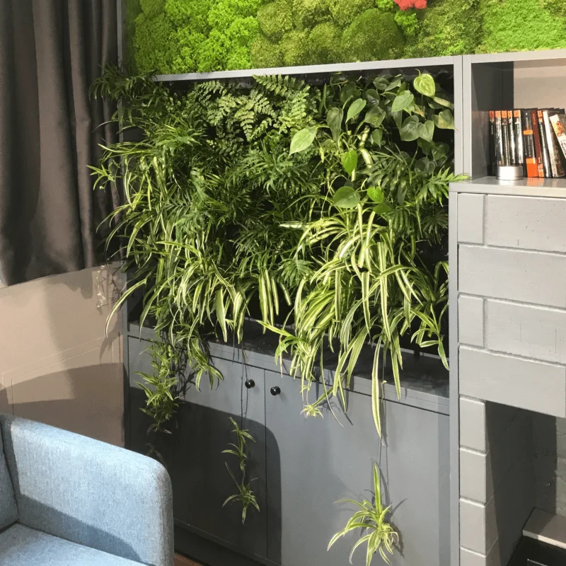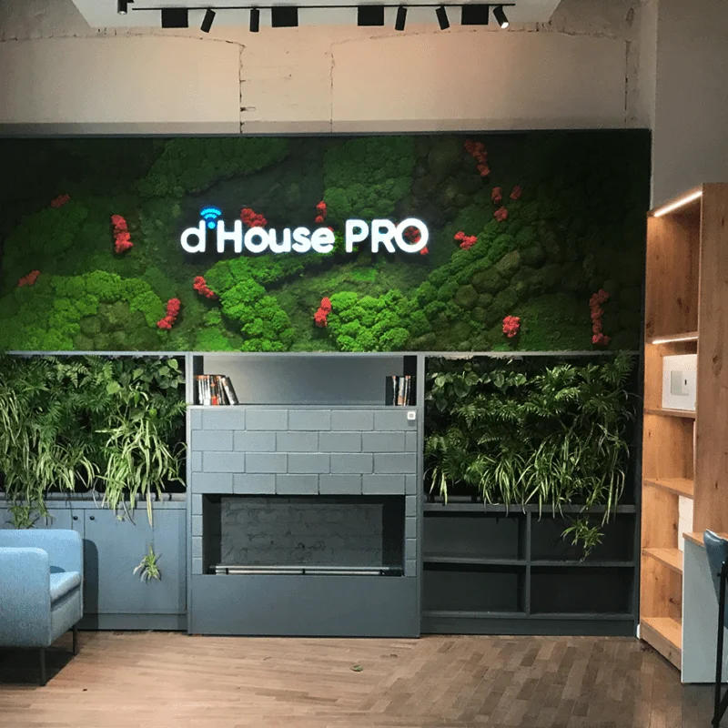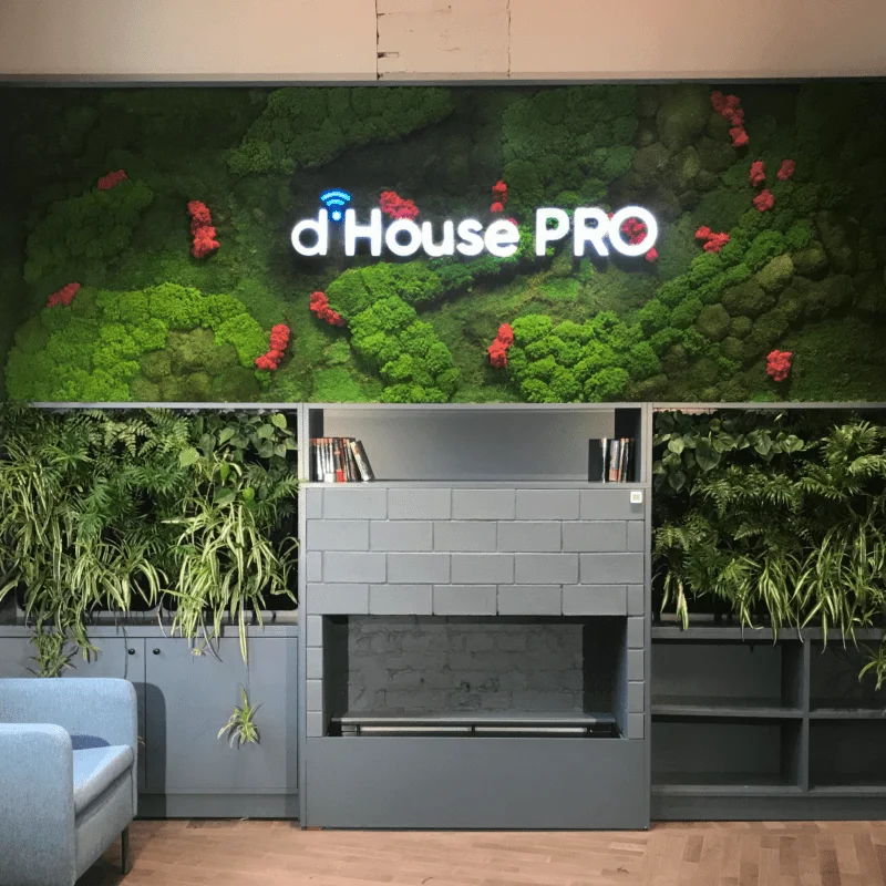 Заказчик попросил нас создать уникальное оформление. Мы объединили панно из стабилизированного мха с логотипом компании и живые фитостены. Для выразительности добавили яркий красный мох ягеля. Результат превзошел ожидания: зеленая стена стала центром притяжения для сотрудников и визитной карточкой компании.