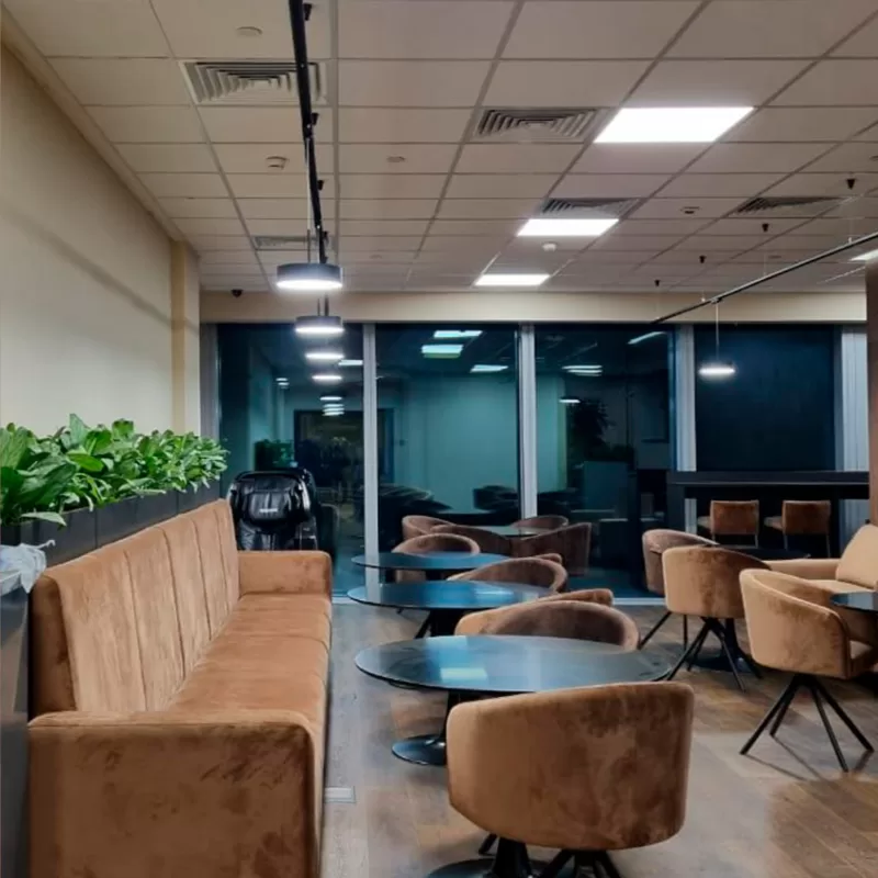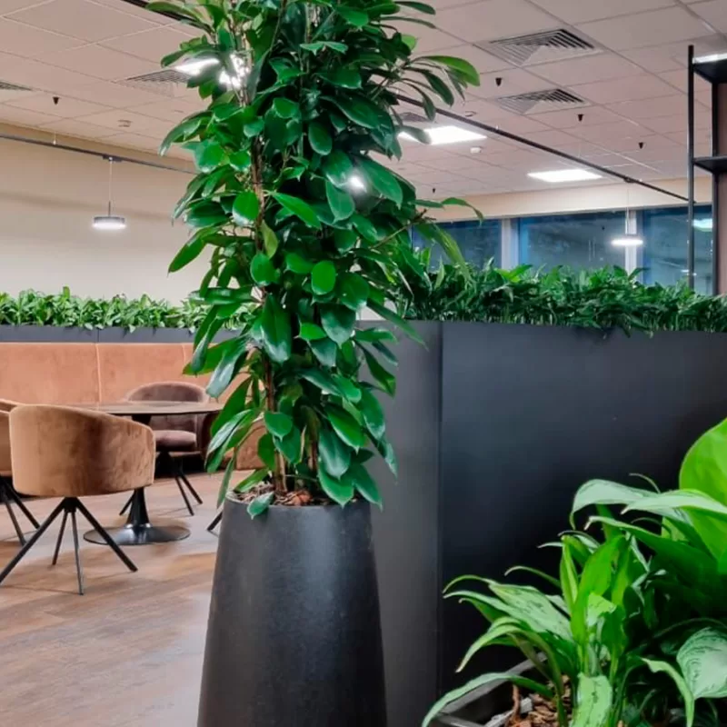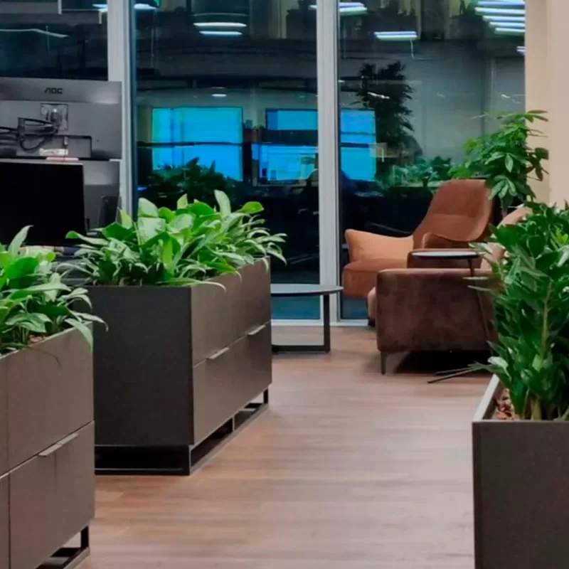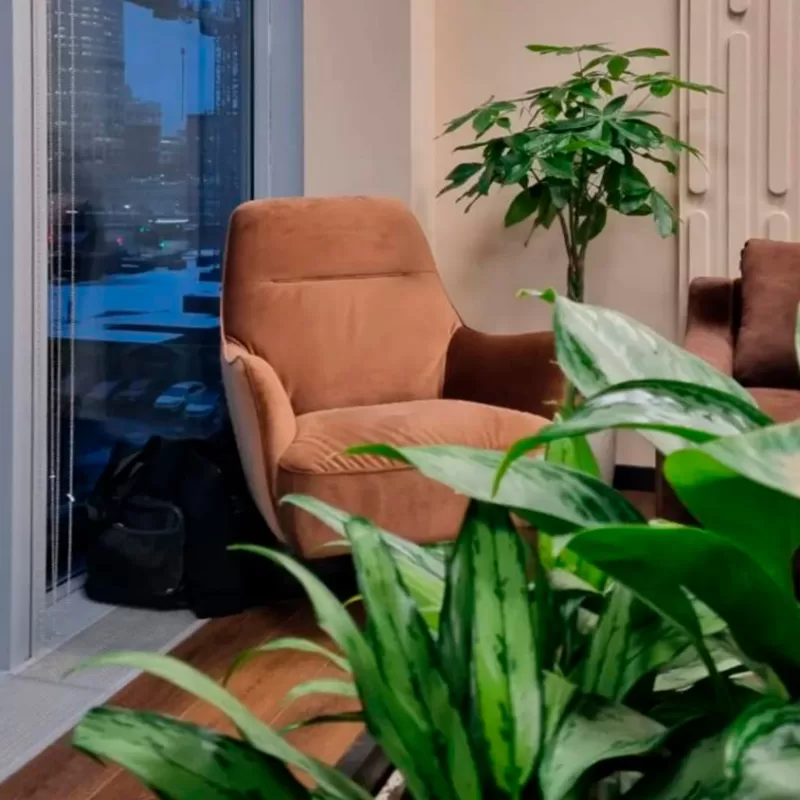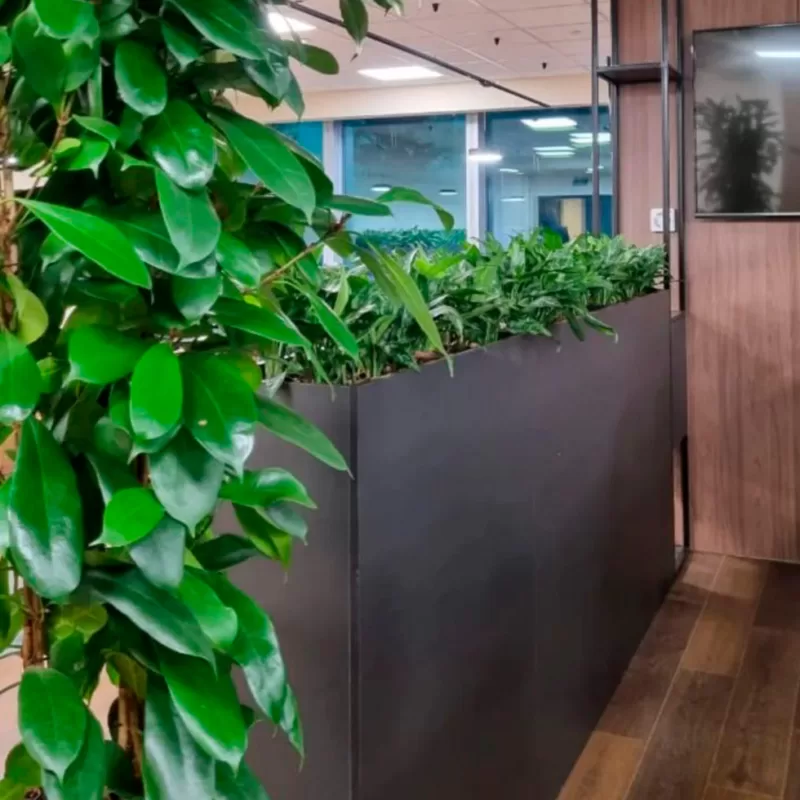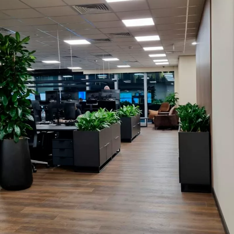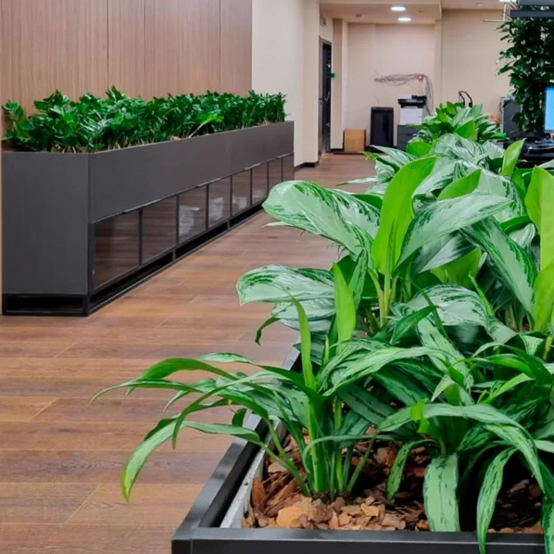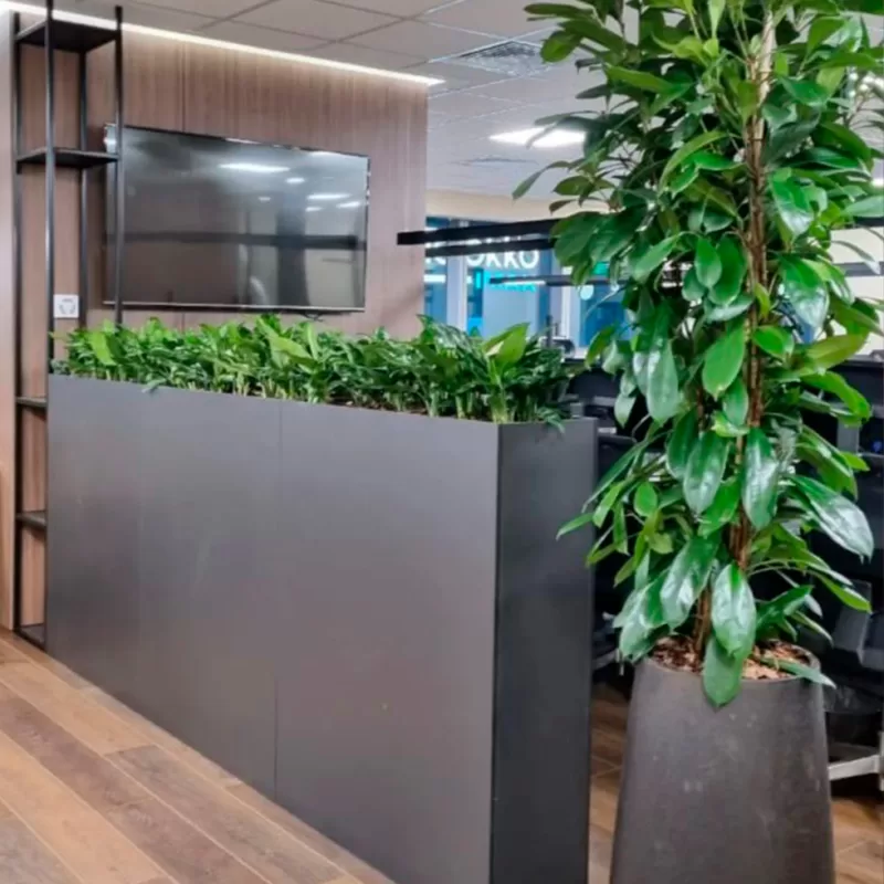 Для озеленения офиса и улучшения его планировки мы установили напольные кашпо с аглаонемами. Эти растения не только украшают интерьер, но и помогают зонировать пространство. Чтобы усилить визуальный эффект, мы добавили фикусы, которые не только красивы, но и улучшают экологию.