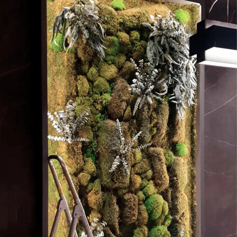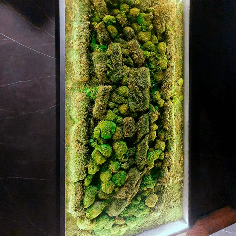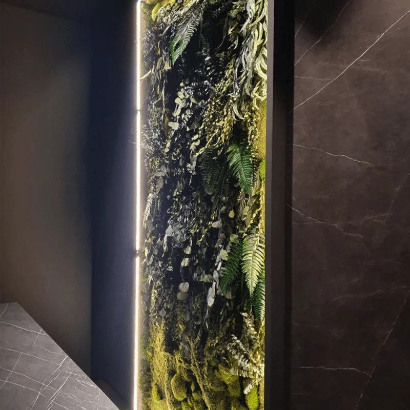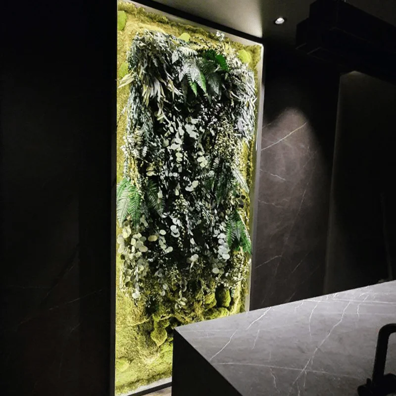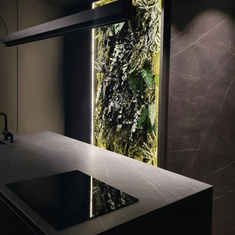 Панно из мха с подсветкой стала акцентом в интерьере кухни, придавая особую атмосферу. Особенно эффектно смотрится в сочетании с натуральным камнем и минималистичным дизайном, дополняя интерьер заказчика.