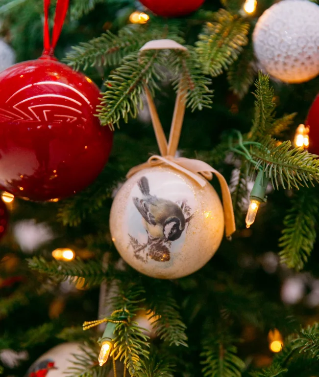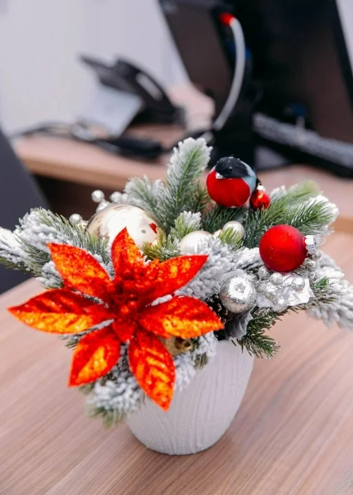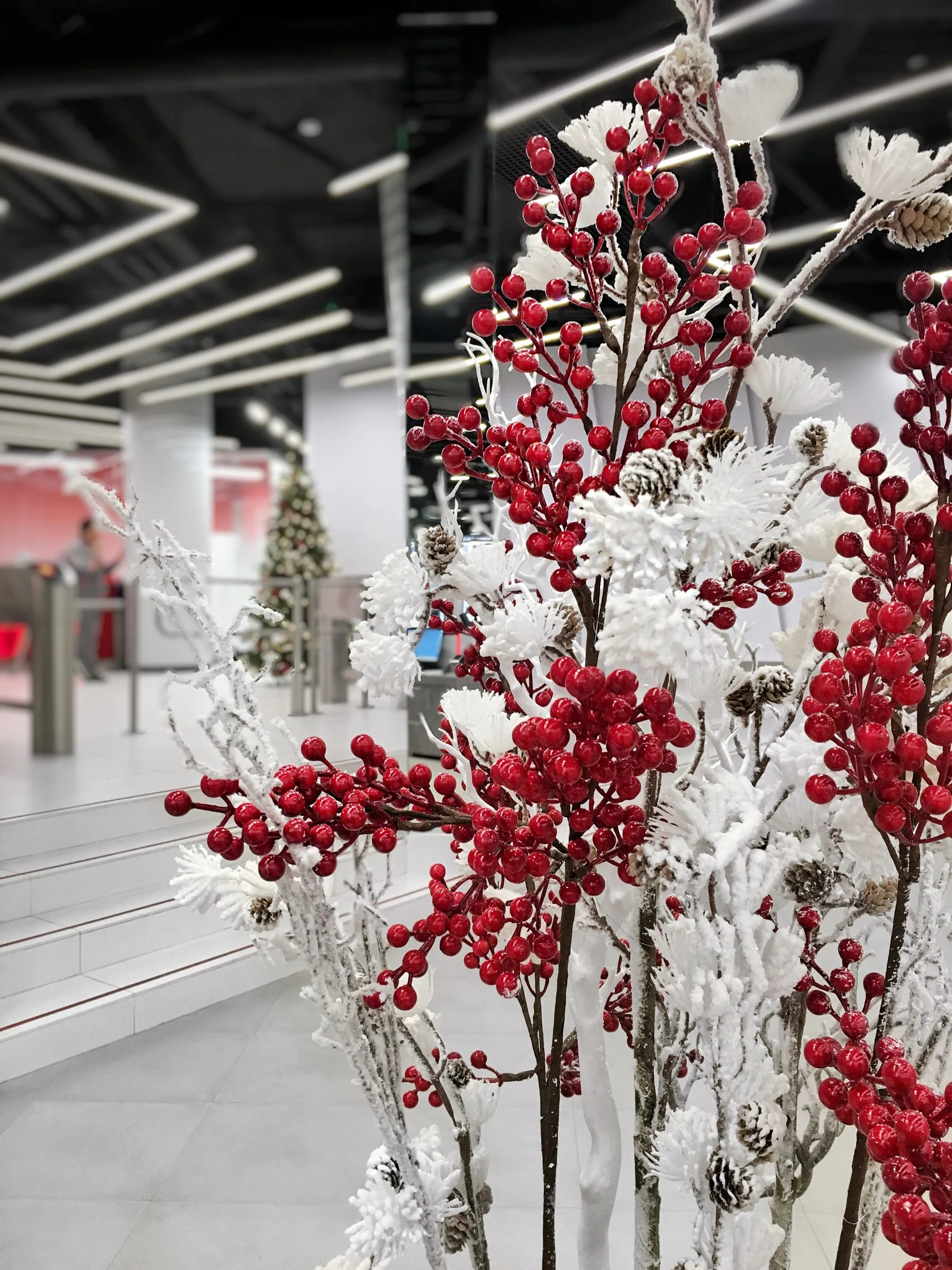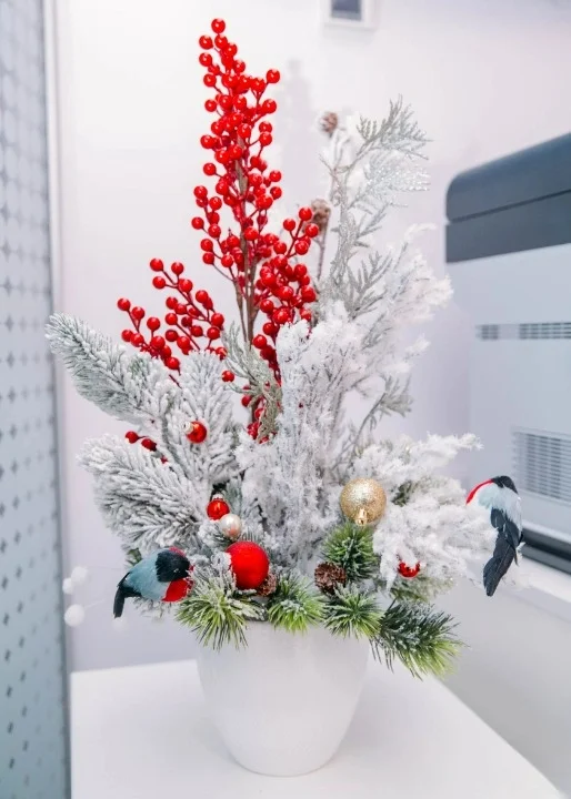 Новогодний декор фитнес-клуба погружает в волшебную сказку. Игрушки и украшения, изображающие лесных жителей, создают праздничное настроение. Ель с литой хвоей и встроенной светодиодной гирляндой украшена декоративными птичками, фигурками из красных ягод и фарфоровыми грибочками.