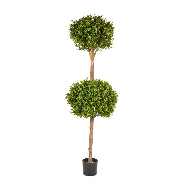 Самшит «Два Шара» с уникальной кроной из двух сферических форм на высоком стволе. Подходит для помещения и улицы благодаря прочной структуре и защитному покрытию.