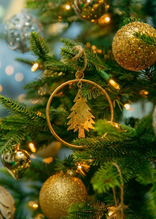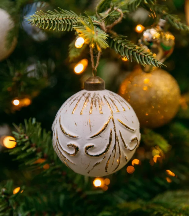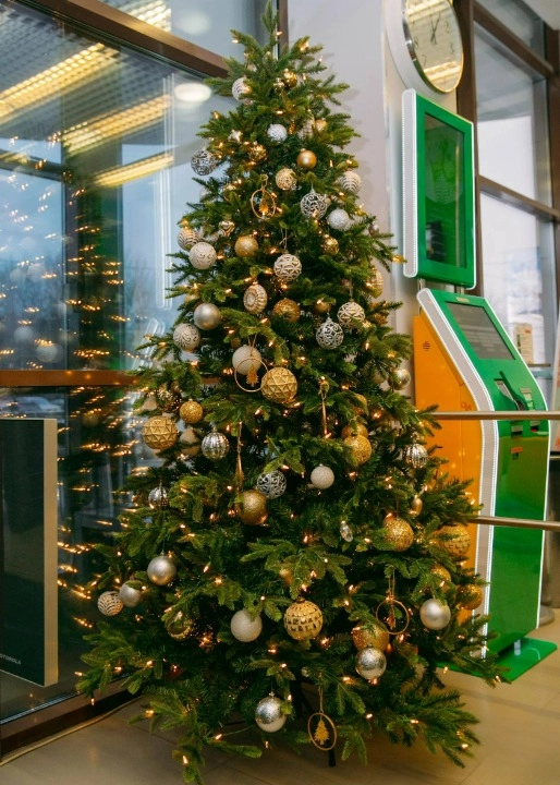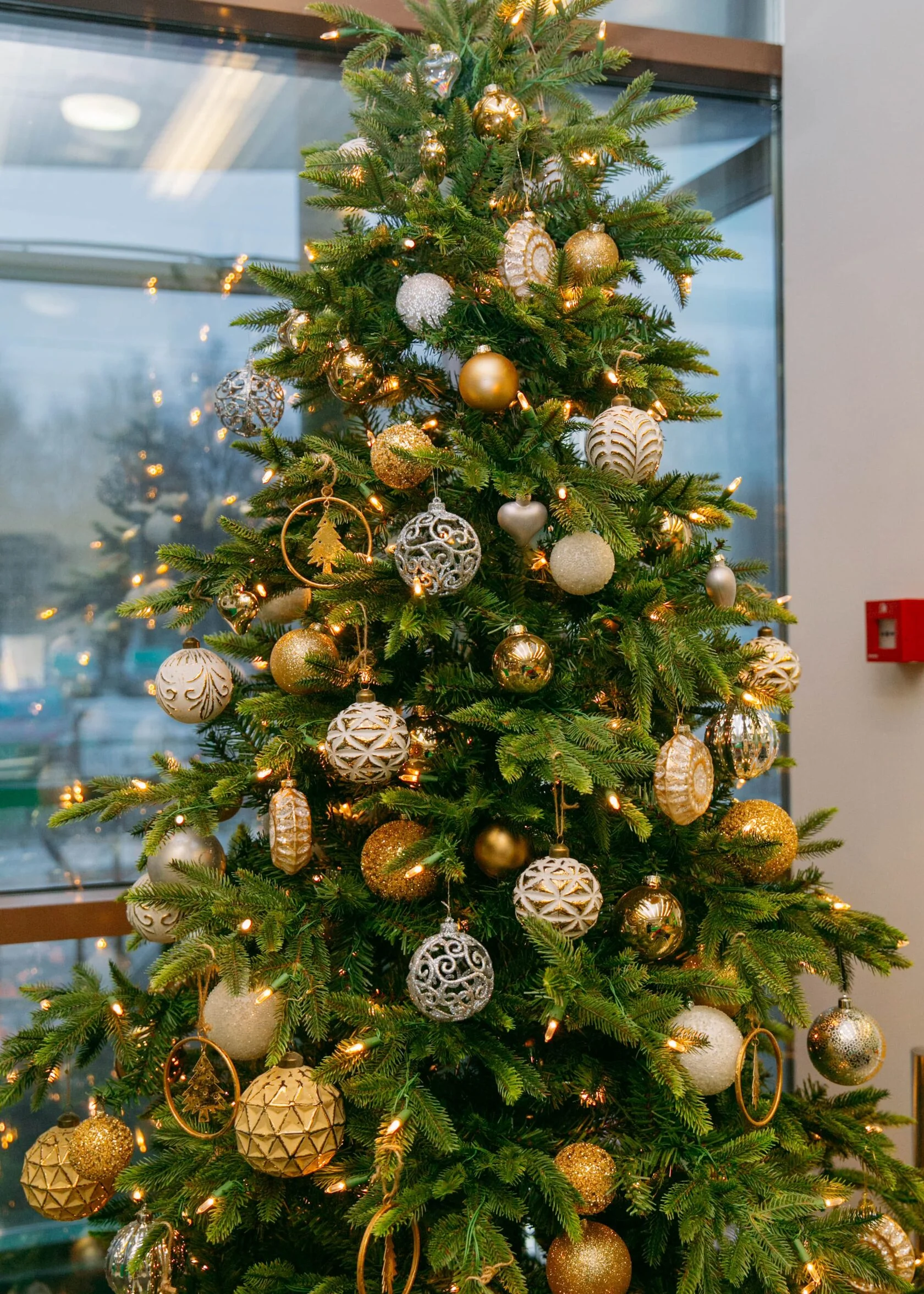 - Центром композиции стала наряженная елка с дизайнерскими шарами и украшениями.