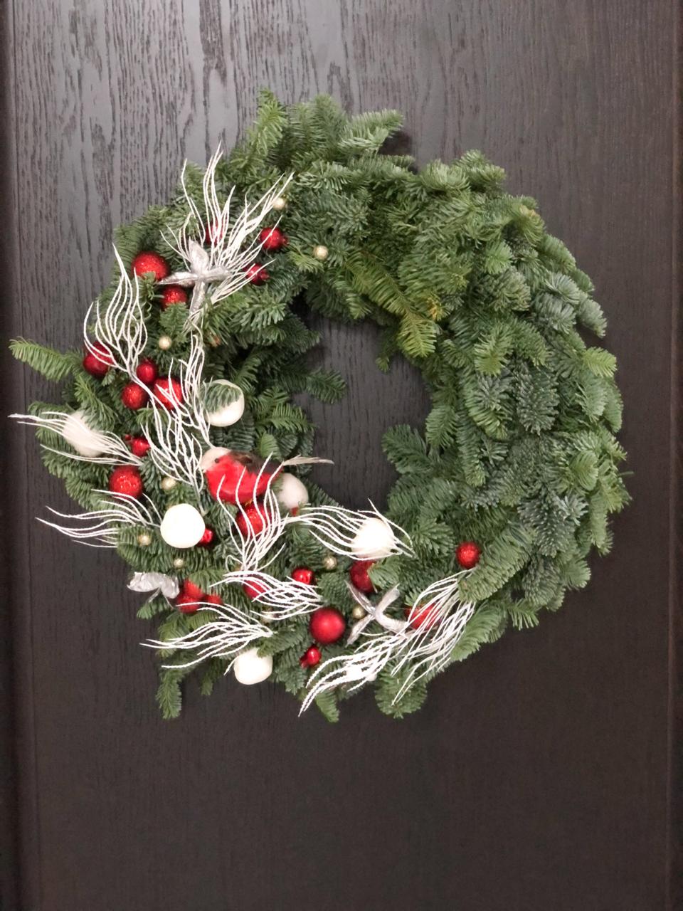 Датский ароматный лапник в качестве декора, украшенный белыми и красными шарами и веточками.