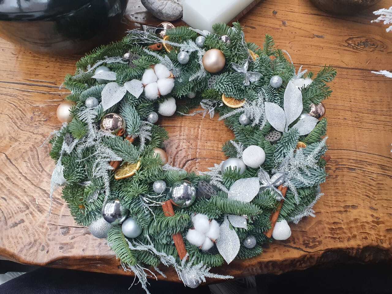 Рождественский венок из натурального датского ароматного лапника. В качестве декора использованы: белые и серебряные шары, корица, хлопок, апельсины.