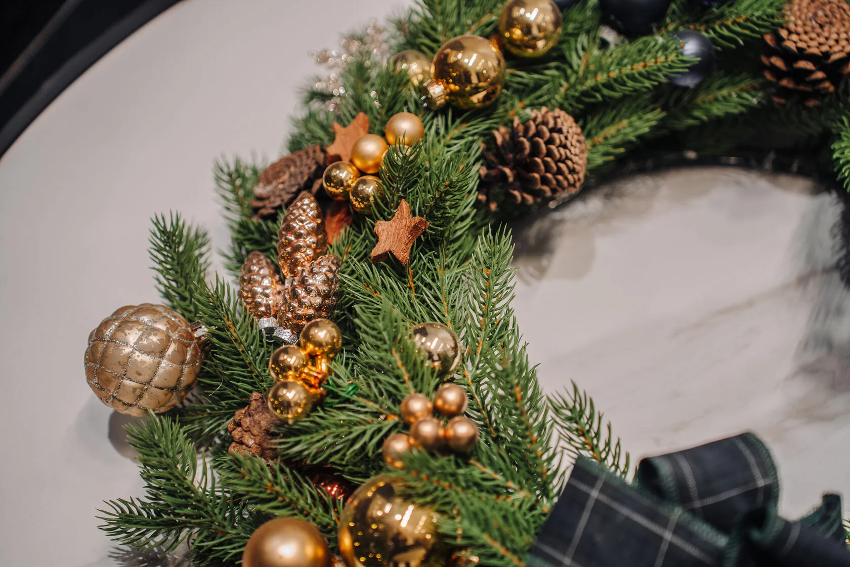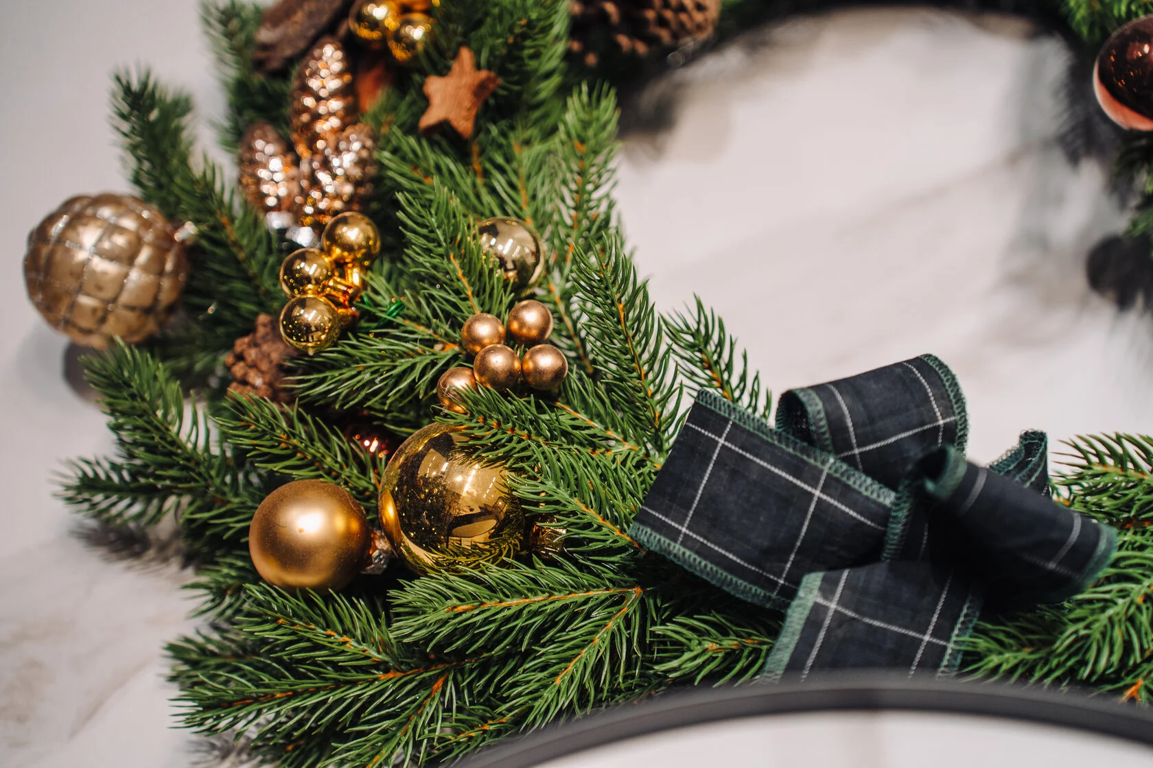 Рождественский венок из еловых веток украшен золотистыми и бронзовыми шарами, шишками и звездочками.