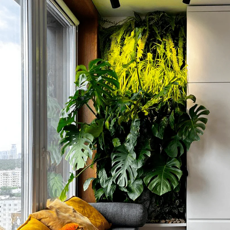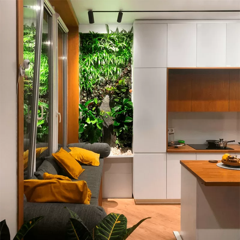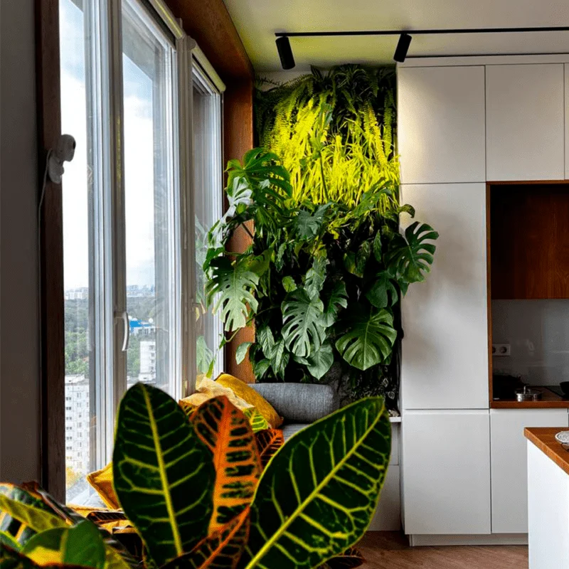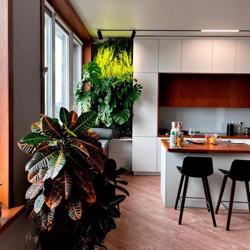 Фитостена в кухонной зоне - это стильное и практичное решение для создания зеленой зоны в ограниченном пространстве. Компактная конструкция позволяет выращивать свежие травы и цветы, экономя место и улучшая качество воздуха.