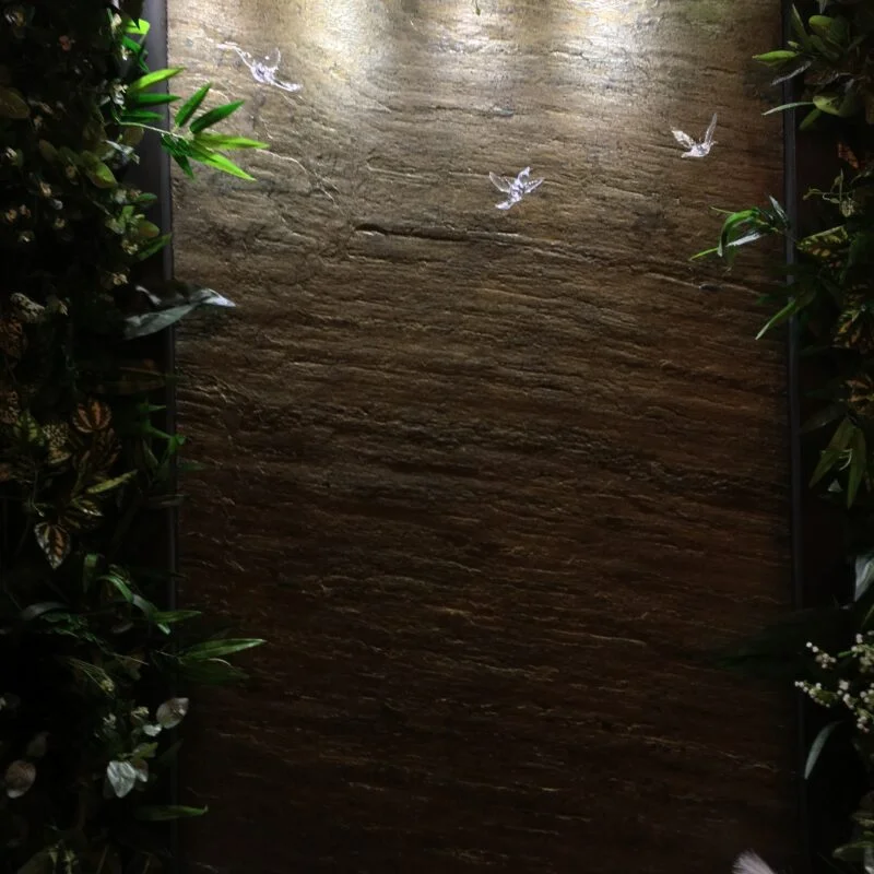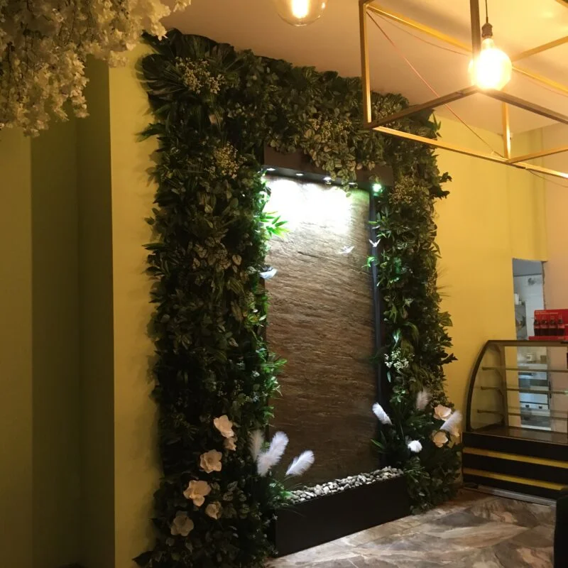 Перед дизайнерами стояла задача создать обрамление для водопада по камню в кафе. Они использовали качественные искусственные растения и гармоничные цвета. Эти элементы стали идеальным дополнением, подчеркнув естественную красоту воды и камня.