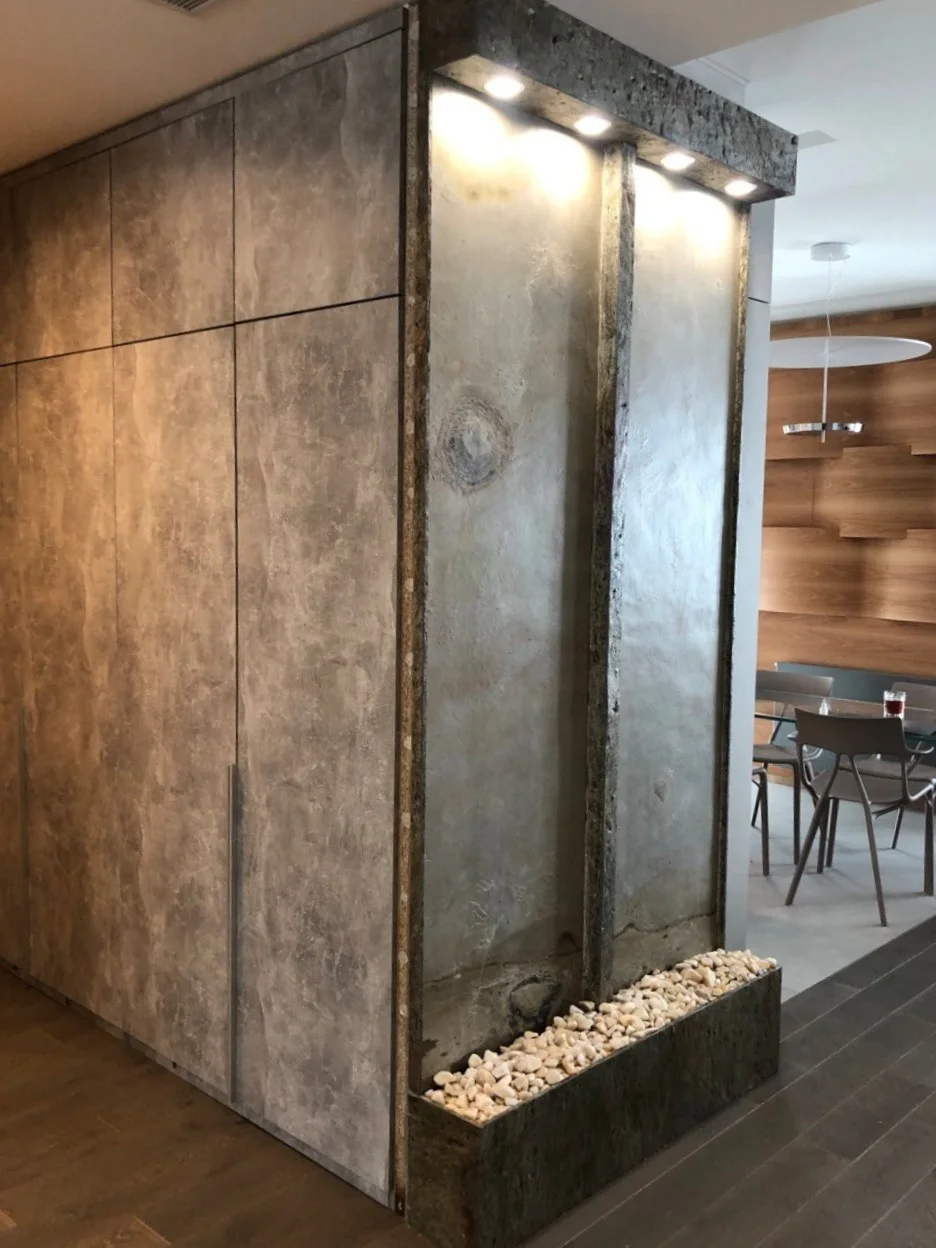 Настенный водопад с подсветкой, как декоративный элемент интерьера, создающий эффект стекающей воды по вертикальной поверхности. Создает особую атмосферу и улучшает микроклимат помещения.
